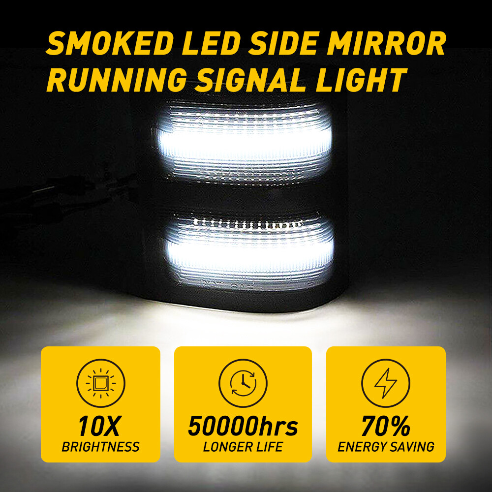 These LED mirror lights are a fantastic upgrade for my Ford F250! The smoked lens gives a sleek look, and the amber turn signals are super bright—much better than the stock ones. Installation was a breeze—just plug and play, no wiring mess. The white running lights add great visibility, and the build feels sturdy. Perfect match for my truck, no fitment issues. Totally worth it!