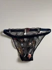 Serendipity presents a size 2 black thong with floral embroidery on mesh fabric. This women's panty features a thong/string style with a flower theme, offering stretch and breathability for comfort. Perfect for those who appreciate delicate accents in their intimates.