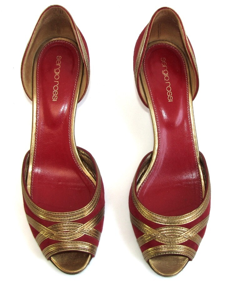 Brand: Sergio Rossi Elegant pumps Open and round ends Small stable heels Excellent quality leather Size: 38.5 Colors & Composition: Color: red and gilded bronze Upper: velvet leather and smooth leather Interior: lined leather Under the foot: leather Measures : Heel height on the back: 5 cm Length of the insole: 24.8 cm (take into account the shape of the end) Width of the exterior sole at the widest point: 8 cm Very good condition Satisfied or reimbursed The photos of my ads are the photos of the items I am selling (no photo taken on the web or in magazines ...) I group your purchases to reduce port costs All my photos are taken in natural light, in order to make the real colors of the items offered for sale as well as possible. Possible color differences in photos of the same article are exclusively due to a variation in daylight exposure. Brand: Sergio Rossi Open and round ends Small stable heels Excellent quality leather Colors & Composition: Color: red and gilded bronze Upper: velvet leather and smooth leather Interior: lined leather Under the foot: leather Heel height on the back: 5 cm Length of the insole: 24.8 cm (take into account the shape of the end) Width of the exterior sole at the widest point: 8 cm Very good condition Satisfied or reimbursed The photos of my ads are the photos of the items I am selling (no photo taken on the web or in magazines ...) I group your purchases to reduce port costs All my photos are taken in natural light, in order to make the real colors of the items offered for sale as well as possible. Possible color differences in photos of the same article are exclusively due to a variation in da