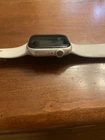 Apple Watch Series 7. Watch has some minor scuffs and marks on it from every day use, and a larger scratch in glass which is shown in pictures. Does not affect the quality or use of the watch. Watch band is stained a blueish/gray color on front and back in some areas. Included is the original USB-C charging cable it came with (no power adapter). Also 1 clear watch case that fits over the screen.