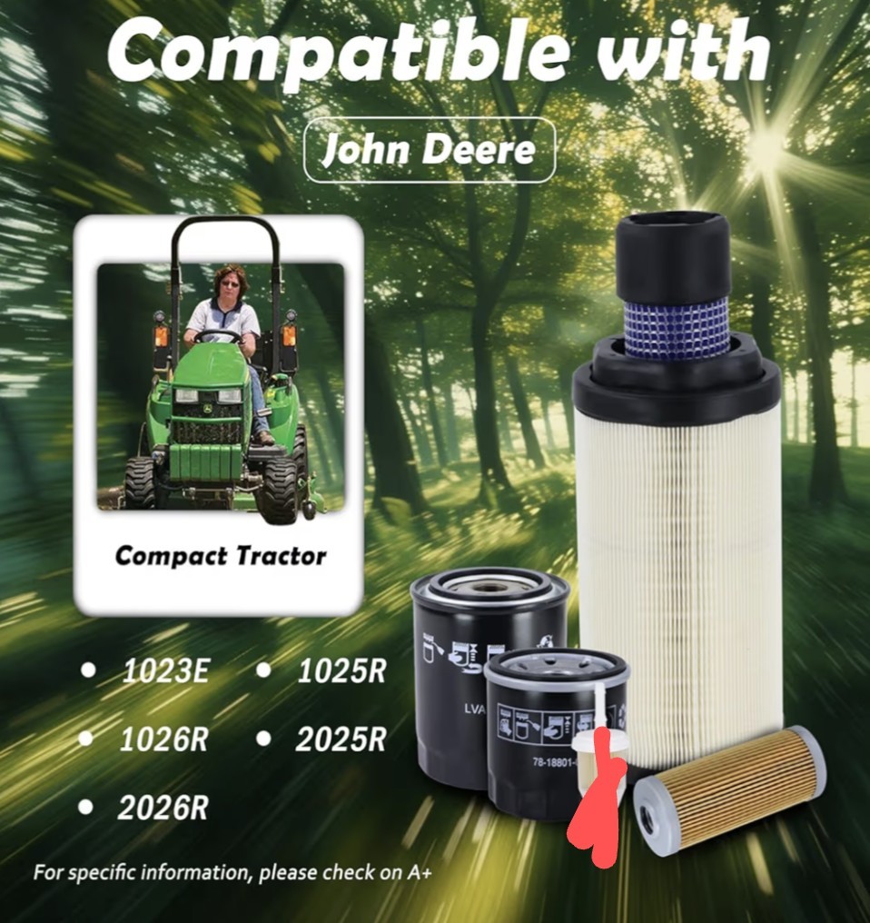 **DOES NOT COME WITH SMALL IN-LINE FUEL FILTER SEEN IN STOCK PHOTOS! 【Compatibility】Compatible with John Deere 1025R 1023E 1026R 2025R 2026R. (Please refer to the product description for specific year models) 【Replaces Part Number】Primary air filter: LVU34503; Secondary air filter: LVU34504; Oil filter: M806418; Engine oil filter: LVA16054, M806418, M131802, MIU804763, AM116304; In-Line fuel filter: AM116304, AM101126, AM116178, AM1163041, GY20709; Fuel filter: M801101, CH10479, 8970713480, MIU804763, 16271-43560, 124550-55700, YM12455055700 【Performance】Dual-stage filtration effectively captures tiny particles and impurities, ensuring that the fuel and air entering the engine are always in the best condition, thus improving the tractor's fuel combustion efficiency, reducing fuel consumption and preventing impurities from damaging the engine. Even in harsh environments, it is resistant to moisture and clogging, providing excellent filtration results Easy to Install】Each component is designed for quick, tool-less installation, helping you maintain your mower without the need for professional repairs, saving you time and money
