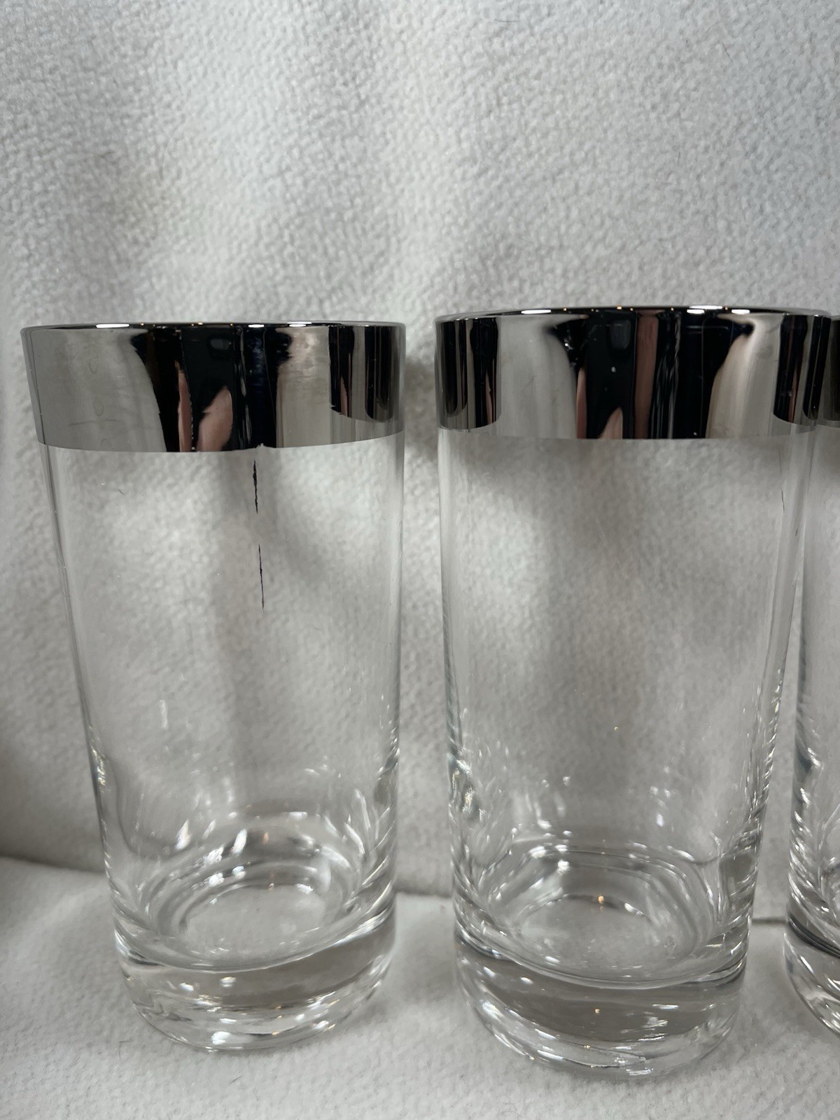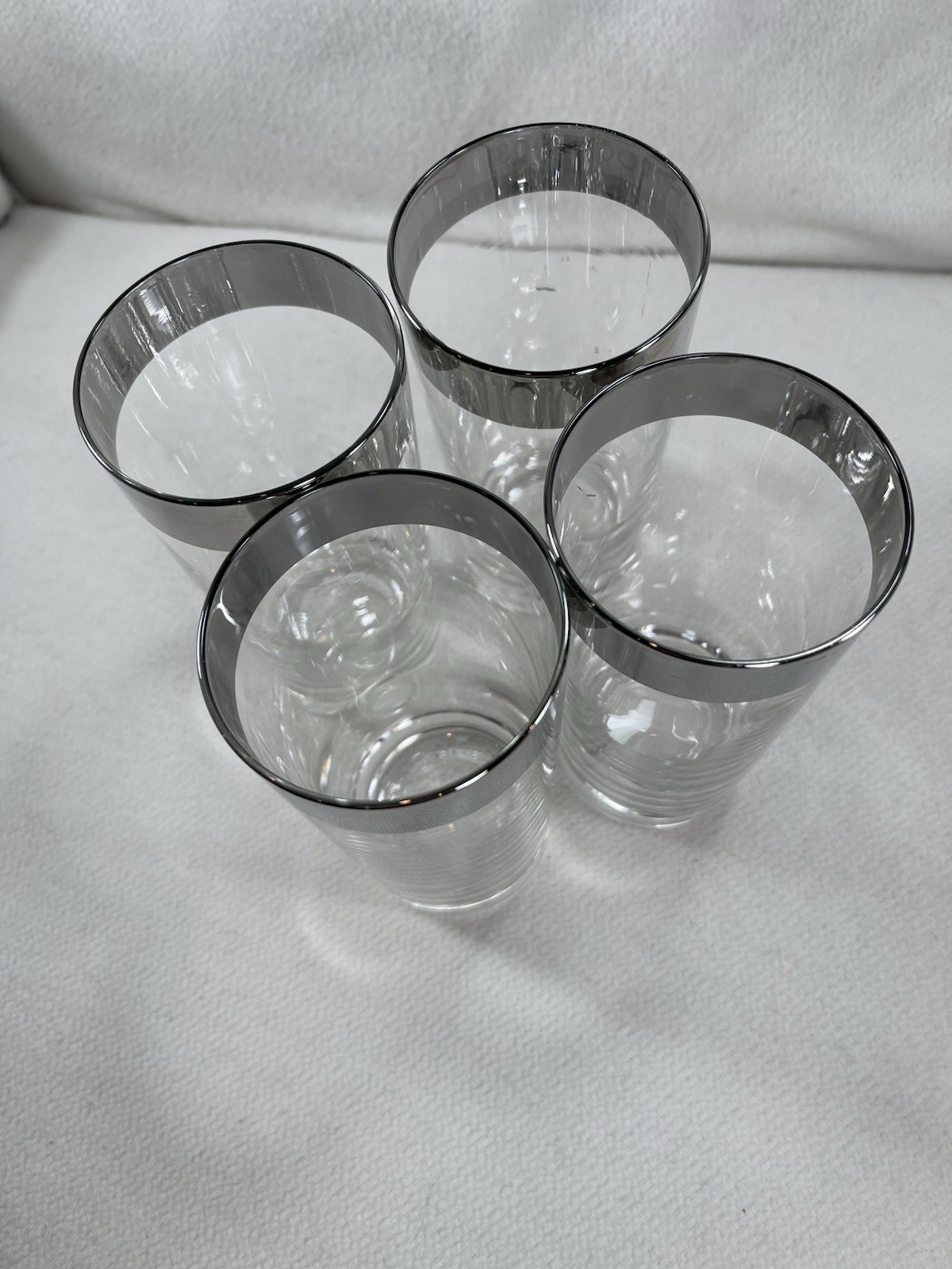 This set of four vintage silver rim highball glasses stands at 5.5 inches tall, making them perfect for all occasions. The elegant mid-century modern style, along with the decorative features, adds a touch of vintage charm to your barware collection. Made of glass with a capacity of 12 oz, these round tumblers are a timeless addition to any home. The silver rim is 3/4” . Excellent vintage condition. No chips or cracks. Three of the glasses have factory defects where silver paint got on the clear glass. See photos.