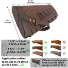 GunButtstock 【Material】Made of buffalo hide leather and waxed canvas, heavy-duty stitching and durable. Buttstock size: 8" x 5 ¾" x 1 ¾”. 【Ergonomic Buttstock】The edge of the gun buttstock that contacted with the shoulder is rounded, and provided 4 pieces neoprene inner cushions, which can greatly reduce 60% buffer force when shooting. 【Caliber .308 .30-06 .45-70】Fit for 4pcs .308 .40-65 .45-70 .22-250 .30-06 .300WIN, .40-40 .40-60 .40-65 .40-70 .44mag, .45 Long Colt, 7MM REM 6.8 SPC and .410 shotgun bullets as well. 【Caliber .357 .30-30 .38】Fit for 5pcs .357, .30-30, .35, .38 .32Win Spcl.32-40. 【Caliber .22LR .22MAG .17HMR】Fit for 8 pcs .22LR .22MAG .17HMR. 【Package Included】1pcs WAYNE'S DOG cheek rest pad. Barrel No Drill Mount 【Material】Made of premium crazy horse leather for strength and durability in the field. 【Anti-slip】5mm Neoprene inner cushion to prevent slippage, this design works so your gun will not roll, but will stay in place. 【For Guns Without Swivels】Our slip on leather loop requires no drilling into the wood of your rifle or shotgun, and adjustable to universal fit. 【Leather Loops Size】Fit Rifle 5 ¼” to 6” in girth. 【Package included】1pcs NO DRILL leather Barrel Mount for rifle or shotgun sling.