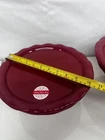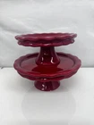 The bigger stand has a small white spot as it shown at the picture. Add a touch of elegance to your dessert presentation with this set of two cake pedestals. The round, footed plates are made of high-quality ceramic and come in diameters of 10" and 12", with a height of 5". The vibrant red color and ruffled design add a pop of color and a feminine touch to any occasion. Perfect for weddings, parties, or just a sweet treat for yourself, these cake stands are sure to impress. The set includes two items and is ideal for displaying your favorite desserts.