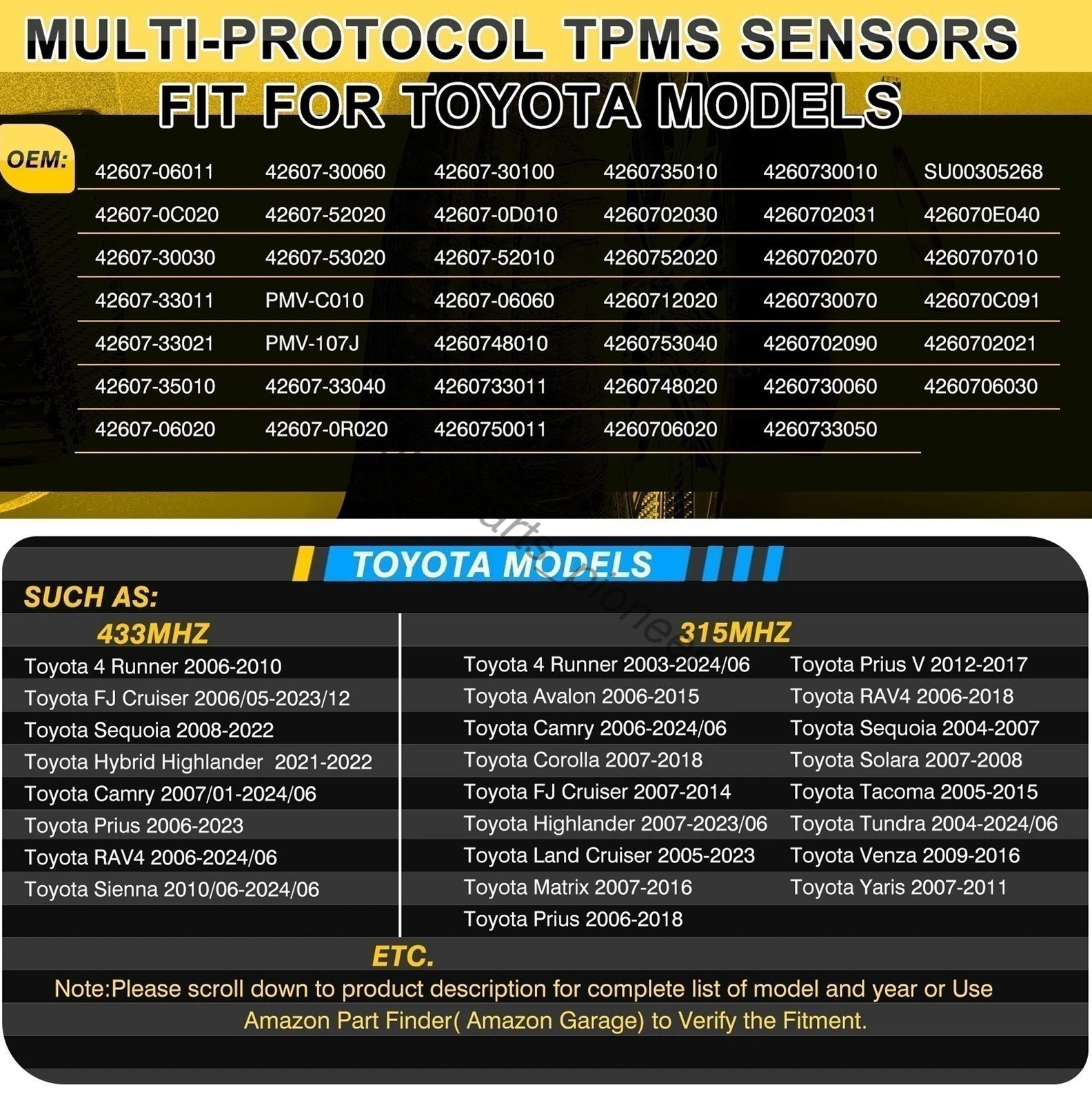 Description: Fitment: Lexus ES300h 2018 Lexus ES350 2018 Lexus IS300 2021 Lexus IS350 2021 Lexus LC500 2018 Lexus LC500h 2018 Lexus LS500 2018 Lexus LS500h 2018 Lexus LX570 2016-2018 Lexus GX460 2016-2017 Lexus RX350 2015-2018 Lexus RX450H 2015-2018 Toyota Avalon(from 2016-01 to 2024-06) Toyota Camry(from 2015-01 to 2017-12) XLE, XLE V6, SE, XSE, XSE V6, SE Hybrid, SLE Hybrid (Hi-Line) Toyota Camry(from 2017-08 to 2018-12) XLE, XLE V6, SE, XSE, XSE V6, SE Hybrid, SLE Hybrid (Hi-Line) Toyota Camry(from 2019-01 to 2020-12) XLE, XLE V6, SE, XSE, XSE V6, SE Hybrid, SLE Hybrid (Hi-Line) Toyota C-HR (from 2018-01 to 2018-12) Toyota Land Cruiser (from 2016-01 to 2018-12) Toyota Sequoia (from 2020-01 to 2020-12) Toyota RAV4(from 2018-12 to 2024-03) Toyota Tacoma(from 2016-01 to 2023-03) Only For Alloy wheels Frequency: 315Mhz/433Mhz Part Number: 42607-06011, 42607-0C020, 42607-30030 , 42607-33011 , 42607-30060, 42607-52020, 42607-53020, PMV-C010 42607-30100, 42607-0D010, 42607-52010, 42607-06060, 4260735010, 4260730010, SU00305268, 426070E040, 4260707010, 4260702030, 4260702031 4260752020, 4260702070, 4260712020, 4260730070, 426070C091, 42607-33021 PMV-107J, 4260748010, 4260753040,4260702090, 4260702021, 42607-35010 42607-06020, 42607-33040, 4260733011, 4260748020, 4260730060, 4260706030 42607-0R020, 4260750011, 4260706020, 4260733050 Package Include: 4PCS x TPMS (Tire Pressure Monitoring Sensor ) Note: Please check part number carefuylly to make sure it fits your model. Installation Process: 1. Loosen the tire: Remove the valve cap and core and deflate the tire. 2. Dismount the tire: Clamp the tire onto the tire changer, and adjust the valve at 1 o’clock relative to the tire separation head. Insert the tire tool and lift the tire bead onto the mounting head to discount the head. 3. Dismount the sensor: With a screwdriver remove the fastening screw and sensor from the Valve stem, then loosen the nut and remove the valve. 4. Mount sensor and valve: Slide the valve stem through the valve hole of the rim. Tighten the screw-nut with 4.0 Nm with the help of the positioning pin. Assemble the sensor body against the rim and tighten the screw. 5. Mount the tire: Place the tire on the rim, making sure that the valve faces the separation head at an angle of 180 degrees. Mount the tire over the rim. Payment Delivery details Returns Contact us Payment We work from Monday - Saturday 9:00AM - 6:00PM PST, but we will reply you once we get your message .There will be some delay on response if you send message or E-Mail on Sunday. Tire Pressure Sensor for HUMMER H3T 2009-2010 4pcs 315Mhz 15122618 20927604 27.08USD Buy it now Free shipping On Jan 6, 2026 at 00:44:05 PST, seller added the following information:
