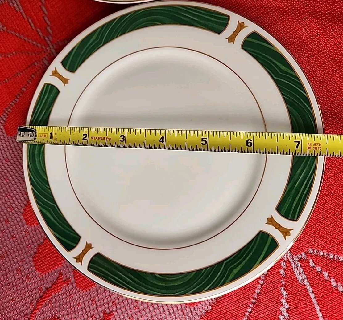 The product is a set of four Sango Majesty Malachite salad plates made of fine china. The plates have a marble look and are decorated with a Malachite pattern. They are round in shape and have a glossy finish. They are suitable for all occasions. The plates are an original product and were made in China. Please examine photos closely to determine the condition of this set. Thank you for looking and God bless you.
