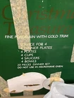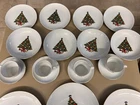 Celebrate the holiday season with this limited edition Jamestown China Christmas Treasure service for 4. The set includes a sauce plate, salad plate, bowl, dinner plate, and cup, all featuring a festive Christmas tree pattern in white porcelain. The round shape and glossy finish of each piece make them stackable and decorative. This vintage set is an original and licensed reproduction from China, with a printed backstamp. Hand wash only and perfect for any Christmas occasion, these plates are a retro addition to your dinnerware collection. Get ready to impress your guests with this elegant and unique Christmas Treasure set from Jamestown China. Missing one plate.