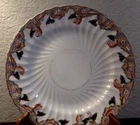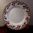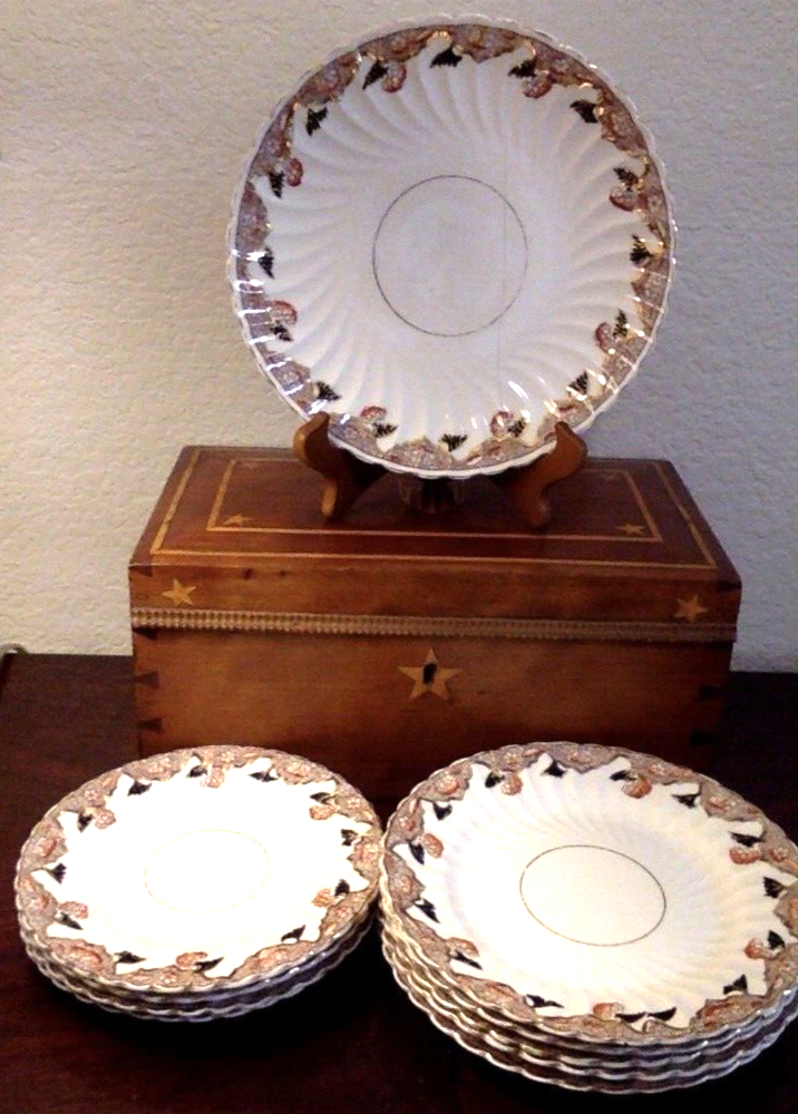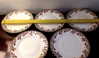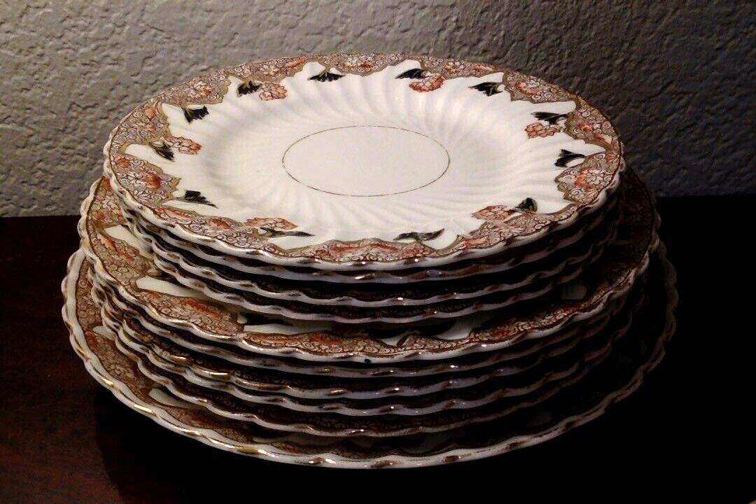Set includes: 1. One large Dinner plate 9 inches wide 2. Five Dessert or Salad plates, 8.25 inches wide 3. Four bread plates, 7 inches wide. Set made by David Chapman & Sons of Longton England, this mark was used from 1882 thru 1904. Do not know the pattern name. These dishes are approximately 130 years old. Set is in good antique condition, the gilding is worn, the backs are hand numbered with the pattern number, there is also impressed writing (stamped into the clay) Looks like "RG" something. There are factory inclusions in the glaze, Don't think this was an expensive set when it was made, I can see this being used everyday in a modest Victorian home. (f I were keeping this set for myself, I would use it as a dessert set, using the largest plate to hold the cake). Ships via UPS ground, carefully boxed. This weighs close to 7 lbs. Pick it up yourself locally for FREE. Thanks for looking, and check out my eBay store for more goodies.