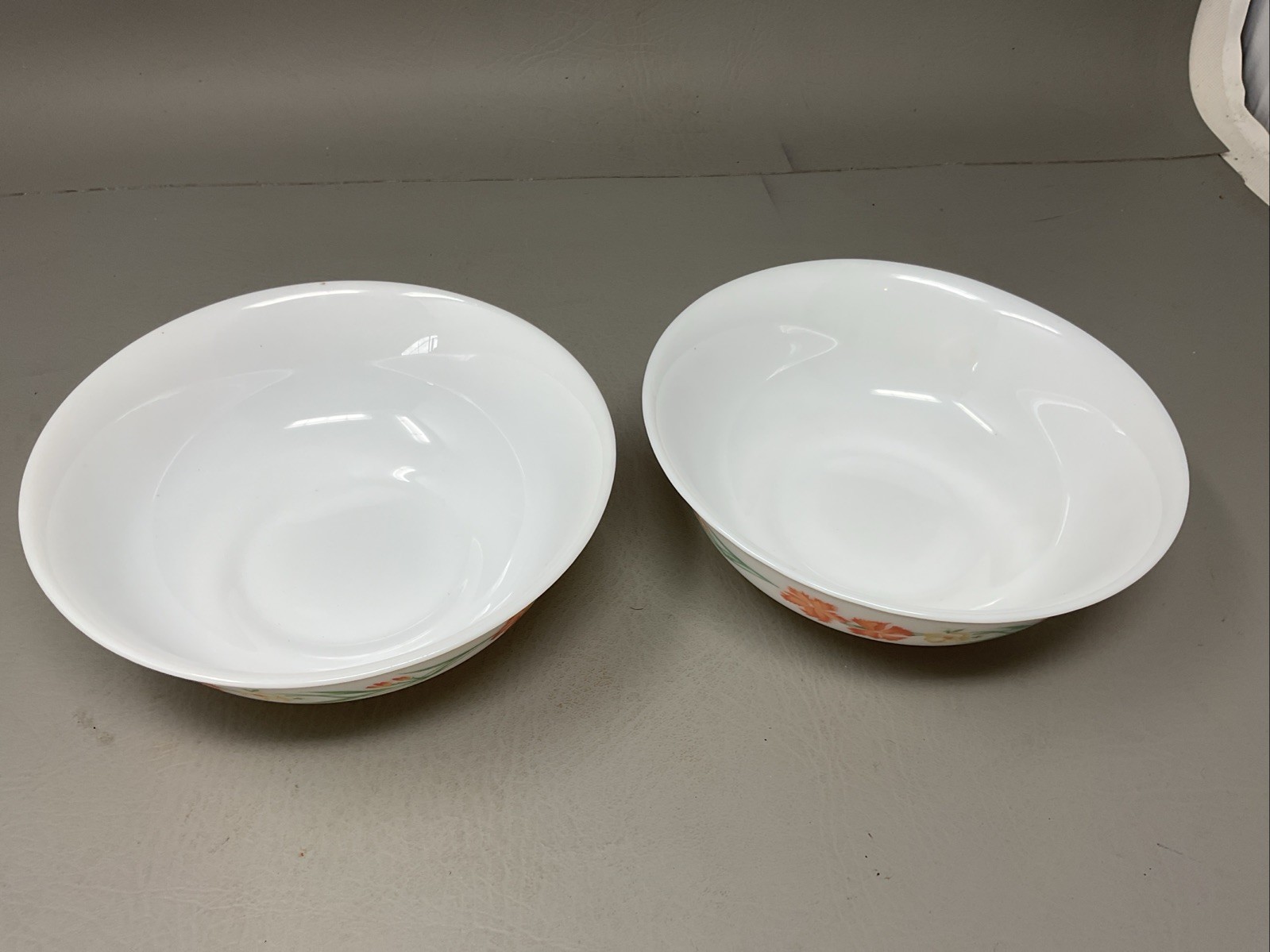 This set of 2 Arcopal France white milk glass orange wildflowers soup or cereal bowls is a vintage find that adds a touch of mid-century modern style to any table setting. With a round shape and a diameter of 6 1/4 inches, these decorative stackable bowls feature a wildflower pattern in white, making them suitable for all occasions. Made of glass and weighing 1 pound 0.9 ounces, these original French-made bowls are a unique addition to your kitchen or dining room collection. Perfect for teens, boys, adults, girls, and unisex kids, these cereal bowls are a charming and functional piece for your home.