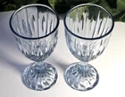 Add elegance to your dining table with this set of two light blue Noritake Entree Crystal wine goblets. Made in Japan in 1993, these round-shaped goblets are perfect for all occasions. The glossy finish and cut pattern make them a great addition to your collection. Each goblet has a capacity of 8 oz and stands at a height of 6.75 inches. They are not signed but are original pieces from the Noritake brand. The production technique is pressed glass and the style is retro. These goblets are perfect for anyone who loves elegant glassware and want to add a touch of sophistication to their home.