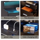 Item description Set of 2 Nightstand Bedside Table 2 Drawers with Charging Station and USB Ports About this item: 【RGB LED Lights 】 The bedside nightstand comes with beautiful Multi-color RGB LED Lights, you can freely adjust the colors and brightness to your preferences, turning a single light to vivid light shows. Whether it's a quiet and peaceful atmosphere or an active and dynamic rhythm, our bedside tables with LED lights completely meet all your needs. 【Charge Your Devices with Ease】 This nightstand comes with 2 Standard Plug Outlets and 2 USB Ports that allow you to charge your phones, lamps and other devices at the same time. You can charge your electronic devices with just a hand's reach, getting convenience to your life with our nightstand. A 4.9ft long power supply cord allows you to move this side table freely. Enjoy the joy of power close at hand! 【Nightstand with Large Storage Space】 This nightstand with charging station provide 4 separate storage spaces for storage and display. The tabletop and open space is convenient for the daily use; 2 closed drawers can hold a lot of personal items and less frequently used items. This end table makes full use of the vertical space in limited corners, making your bedroom and living room neat and organized. 【Sturdy & Durable Construction】 The nightstand is constructed of high-quality particle board which is thick and durable enough to strongly support the nightstand itself and stuff inside or on it. Metal slides and handles make the drawers open and close smoothly, high quality waterproof surface treatment, easy to clean and maintain to ensure a long service life. Perfect for your bedroom as a night stand, living room as a side sofa table and a variety of scenes that meet your needs. 【Easy Assembly & Satisfactory Service】 Detailed instructions and all labeled parts accessories are included. Just follow the easy-to-understand instructions and finish the nightstand assembly quickly and easily. Specifications: 1. Dimensions: (15.7 x 15.7 x 23.6)in / (40 x 40 x 60)cm (L x W x H) 2. Color: Black 3. Material: MDF with Painted Finish, Metal Drawer Runner 4. Drawer Size (Inner): 13.8 in W x 3 in H 5. Power Strip : 2 AC Outlets(125V/12A), 2 USB Ports(5V/2A) 6. Product Load Capacity: 70 lbs 7. Drawer Load Capacity: 20 lbs Package includes: 2 x Nightstand