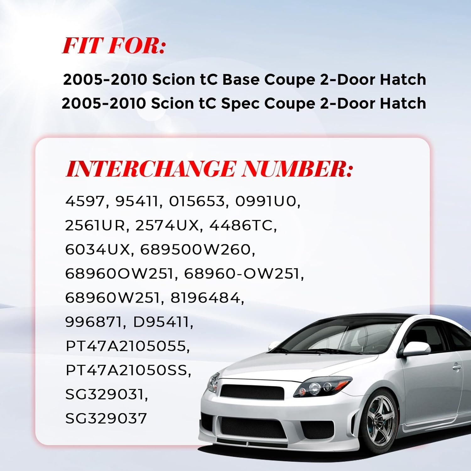 Only fit for 2005-2010 Scion tC, Please check your car model: 2005-2010 Scion tC Base Coupe 2-Door Liftgate-With added lifting pressure over OEM 2005-2010 Scion tC Spec Coupe 2-Door Liftgate-With added lifting pressure over OEM Description: OE Number:P8671,4597,SG329031,4597,8196484,015653,996871 Placement:Rear Hatch / Trunk / Tailgate Extended Length:17 in Compressed Length:11 in Package: 2 x Lift Supports Product Description Fit for: 2005-2010 Scion tC Base Coupe 2-Door 2005-2010 Scion tC Spec Coupe 2-Door Specifications Vehicle Location: Trunk Lid Extended Length: 17" Compressed Length: 11" Hood Lift Supports Display Rear Window Lift Supports Display Trunk Lift Supports Display