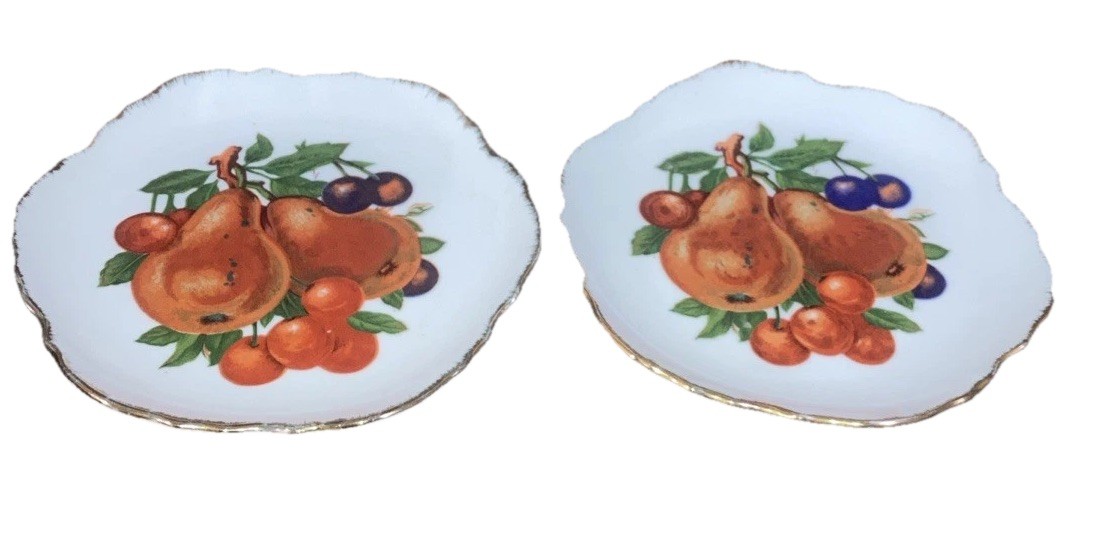 This product is a set of two vintage fruit decorative hanging plates with a scalloped rim and gold trim. These collector plates are perfect for adding a touch of elegance and charm to any home decor. The plates feature a classic design with a golden color that complements various styles of decor. Ideal for collectors or for adding a decorative accent to a room, these plates are sure to be a unique and stylish addition to your collection.