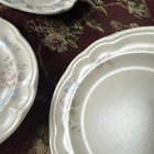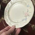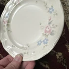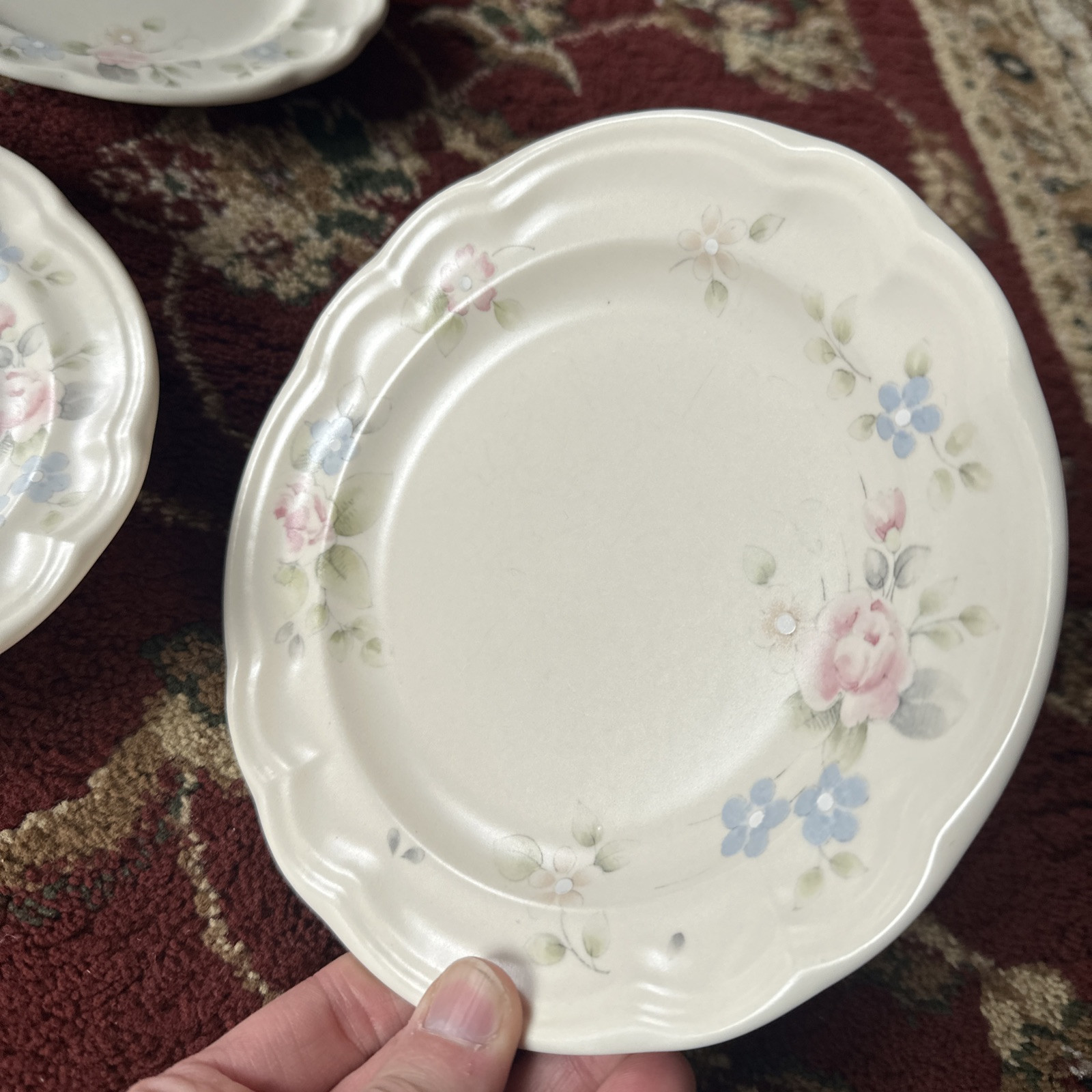 This set of 3 Pfaltzgraff Tea Rose dessert and salad plates is a great addition to any table. The plates measure 7.25" and feature a beautiful floral design in ivory, pink, green, and blue. Made of stoneware, these plates are durable and can be put in the dishwasher or microwave without any worries. The set includes eight salad plates, but can also be used for dessert or as a set. The brand is Pfaltzgraff, and the production style is art pottery. These plates are perfect for all occasions and will add a touch of elegance to any meal. Good used condition, no chips or cracks, normal wear.