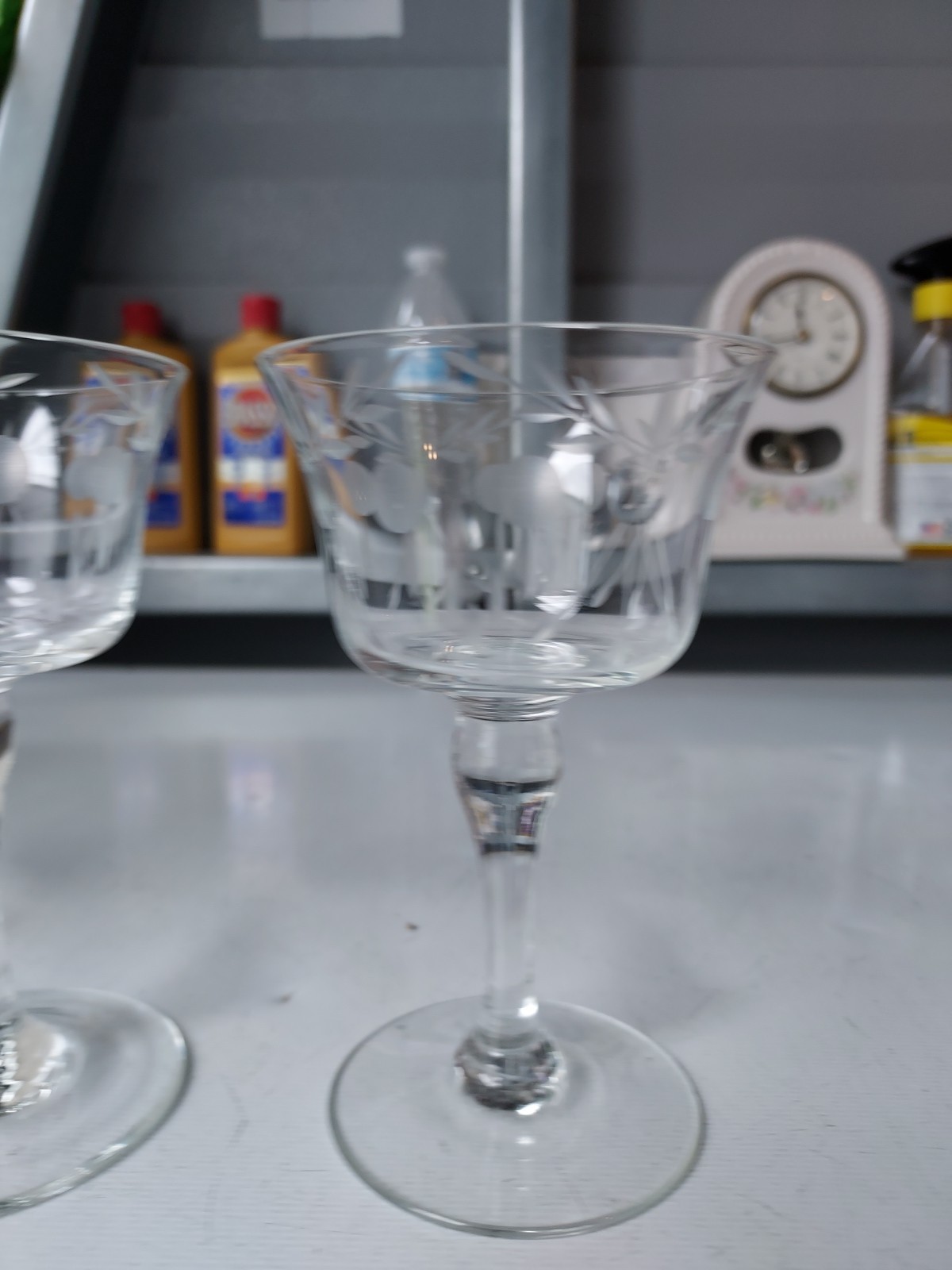 Elevate your home bar with this set of three beautifully etched cocktail glasses. Each glass stands 4 and one half inches tall and is 3 inches wide, perfect for your favorite mixed drinks. The clear glass allows you to see the vibrant colors of your drink while the etched features add a touch of elegance to your presentation. These glasses are perfect for any occasion, whether a cozy night in or a formal dinner party. Add them to your collection today and impress your guests with your hosting skills.