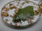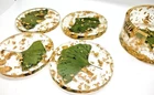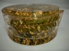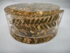 These unique set of 4 coasters with holder measure 3,25" in diameter and when stacked in their holder, measure 1.75' in height. They have gold flecks in them as well as green plants. Some of the plants and gold flecks stick up through the acrylic so objects may not sit flat on the coasters. PLEASE see all photographs as they are part of the description. Shipped with USPS Ground Mail. Os