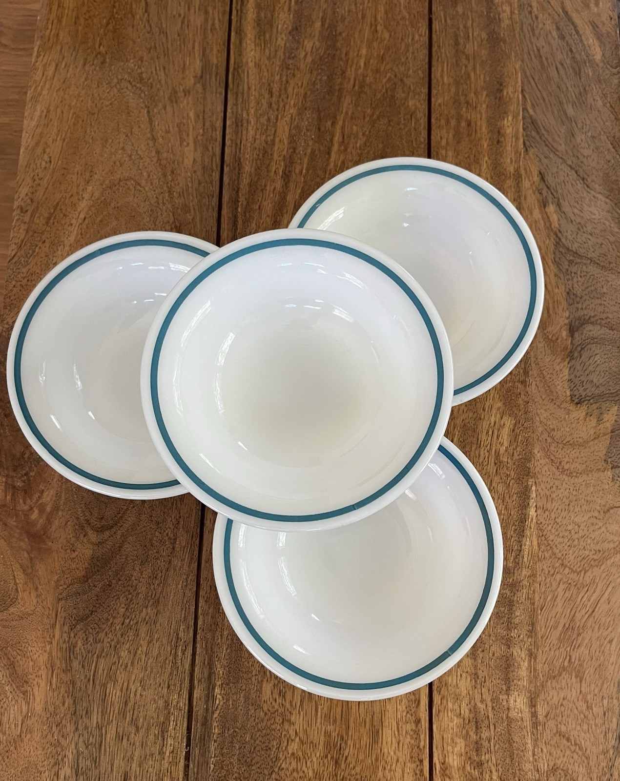 This set of four anchor hocking Fire-King 350 Series soup bowls is a wonderful addition to your vintage glassware collection. Made in the United States, these bowls feature a glossy finish and a beautiful milk glass production style. The white color of the bowls is complemented by a teal/aqua hue, adding a touch of elegance to any table setting. Each bowl has a capacity of 7.5 ounces and is perfect for all occasions. The bowls are stackable and have a vintage look that is sure to impress your guests. Produced by Anchor Hocking, these bowls are of high quality and will last for years to come.