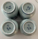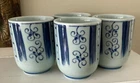 Set of 4 Japanese Sake Tea Cups Blue White Marked Footed Pottery Porcelain. 3 1/4” tall, 2 3/8” across top. Preowned/condition is used. Please use zoom to see detail and condition. Very nice set with unique pattern. Shipping in Continental US only. Shipping USPS Ground Advantage.