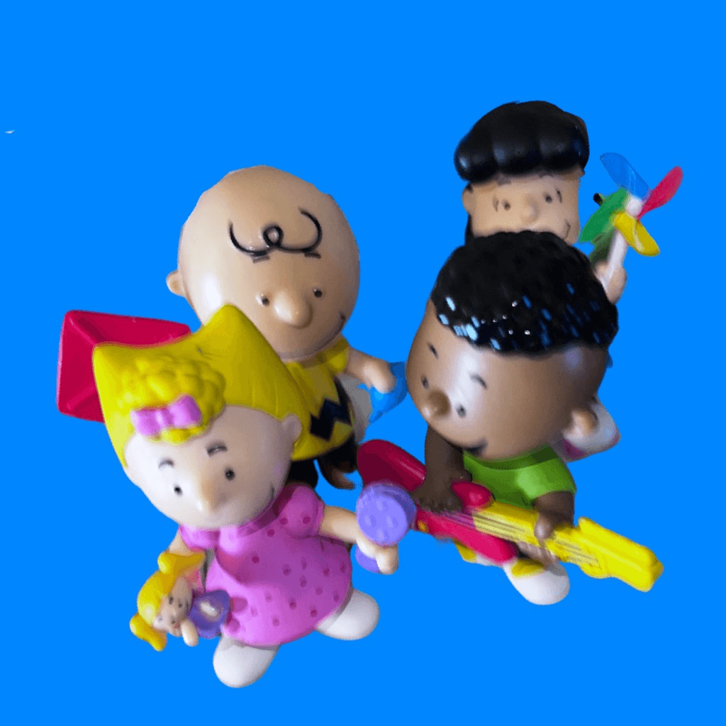 Set of 4 Just Play Peanuts Collector Figures B1 Charlie Brown & Kite Sally and her dolly Franklin & Guitar Lucy & Pinwheel on skates Great shape Clean Smoke free home