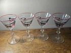 Add a touch of mid-century modern charm to your drinkware collection with this set of four Libbey Coaching Days Cordial Cocktail glasses. The glasses feature a colorful graphic print coach pattern and are made of pressed glass material. Each glass stands at 5.25 inches tall and has a round shape, making them perfect for serving cordials and cocktails. These vintage glasses are a great addition to any home bar or collection. They were produced in the United States using a fused glass technique and are perfect for entertaining guests. Whether you're hosting a party or just enjoying a drink at home, these glasses are sure to impress.