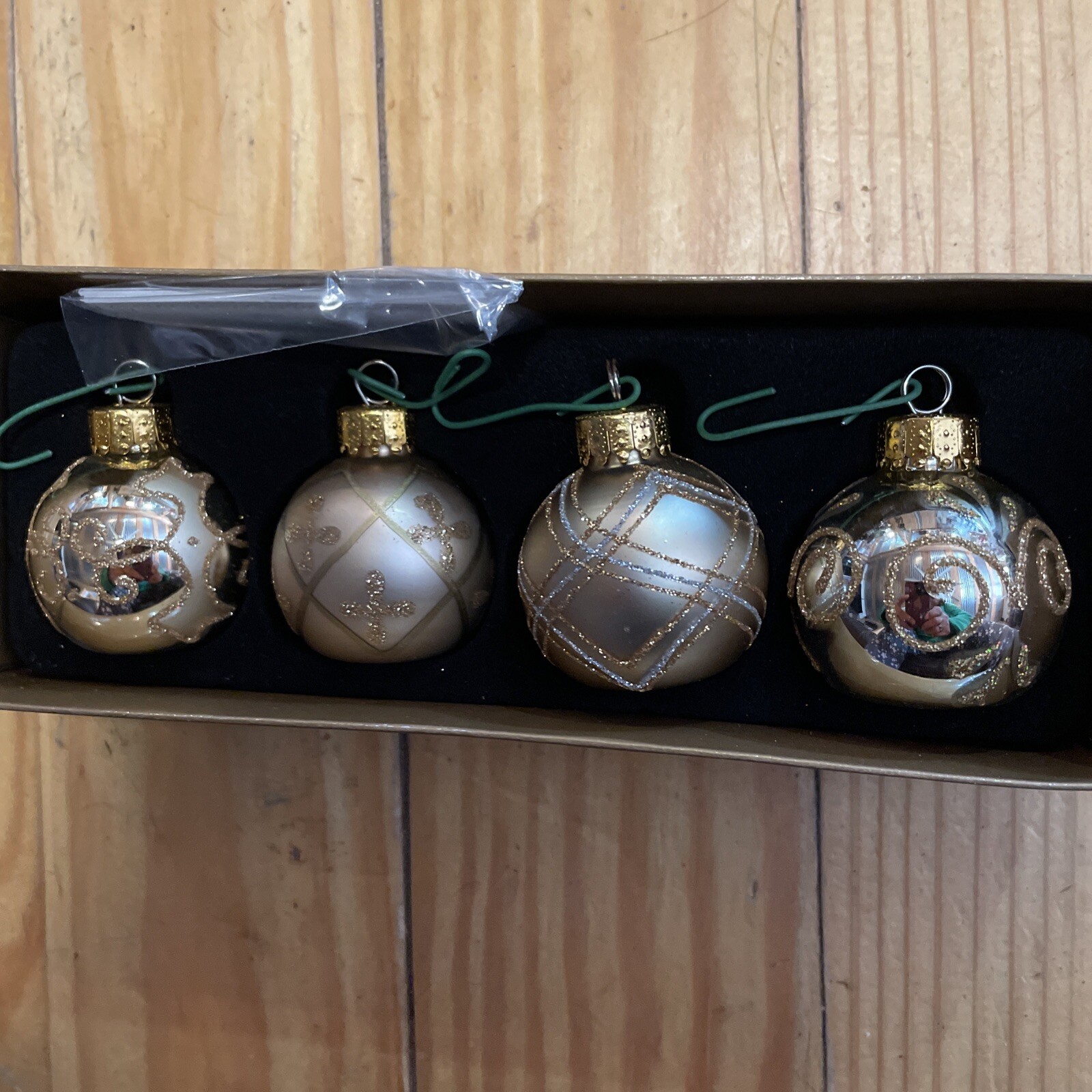 Add a touch of elegance to your Christmas decor with this set of 4 Michaels Glass Christmas Ornaments. These round ornaments are hand-blown with a beautiful gold color and embellished with glitter for a stunning effect. The flat bottom design ensures that they will hang properly on your tree or in any display. Each ornament is small in size, measuring 1.57 inches in height, and is perfect for any recipient or occasion. The vintage-inspired design adds a classic touch to your holiday decor. These ornaments are a must-have for any collector or for those who appreciate unique and beautiful decorations.