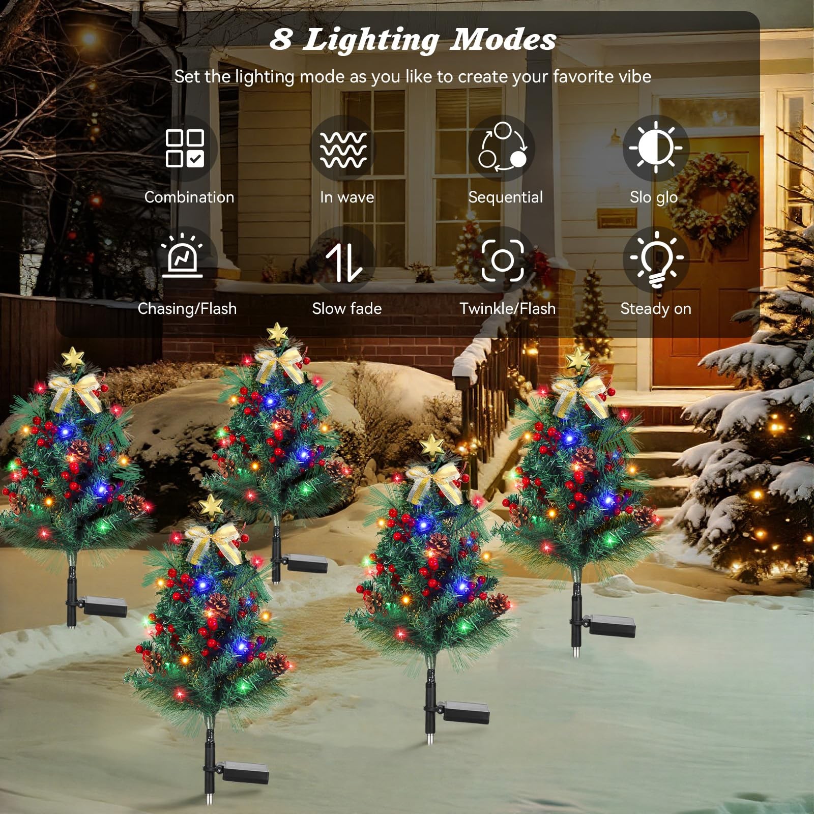 Prelit Outdoor Christmas Trees for Porch Features 1. Classic Decorations: The evergreen branches of the pre-lit Christmas tree are adorned with 4 x 6-pointed Star, 12 Gold Bows, 12 Pinecones, 48 x 7-forked Red Fruits. These decorations create a vivid and festive color collision, naturally blending with existing Christmas decor to instantly create a sense of festive ritual. 2. Flexible Placement: It can be symmetrically displayed on both sides of doorways, along courtyard paths, or in gardens. It can also be placed in the corner of the living room, beside the dining table, or by the bedroom door. 3. Multiple Lighting Modes: When lit, the warm white lights make your artificial prelit Christmas tree dazzle with light and color. It supports constant light and flashing modes. 4. Tool-Free Installation: The 3 stainless steel ground stakes of the Christmas tree can be easily inserted into grass to secure it firmly, and can be simply lifted vertically to remove. Specification Outdoor Porch Christmas Tree Size: 29.53 in/75 cm × 13.78 in/35 cm Ground Stake Height: 11.42 in/ 29 cm Packing List 4 x Outdoor Pathway Christmas Trees Realistic Artificial Christmas Tree: Our prelit pathway Christmas tree is 29.53 in/75 cm tall. The lush evergreen branches are decorated with 4 x 6-pointed star, 12 gold bows, 12 pinecones and 48 x 7-forked red fruits. It looks like a real mini Christmas tree and creates a warm and festive atmosphere whether placed on both sides of your door or along your patio path. LED Lights With Multiple Lighting Modes: Each of the pre lit outdoor Christmas tree is powered by solar. It has 8 light modes, you can set the lighting mode as you like to create your favorite vibe. High Quality Material: The outdoor porch Christmas tree is made of waterproof plastic with excellent durability and fade resistance, suitable for indoor and outdoor use. The Christmas tree ground stakes are made of sturdy stainless steel, rust and corrosion resistant, suitable for long time use. The height of the ground stakes is 11.42 in/ 29 cm. Easy Installation and Removal: The outdoor mini Christmas tree comes with sturdy three-legged metal stakes that hold the tree firmly in place on the grass and keep it stable in windy conditions. It is also easy and quick to remove, just lift upwards to retrieve it without leaving visible marks on the grass and protect the beauty of the grass. Exquisite Decoration: This set of 4 Christmas trees outdoor can be placed on either side of doorways, along pathways, or in gardens to add elegance. It can also be placed in pots in the living room corner or by the bedroom doorways to create a strong Christmas atmosphere, making it an ideal choice for Christmas decor.