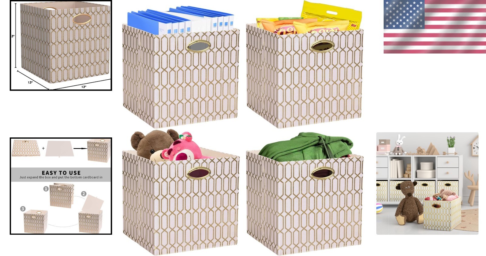 Set of 4 Stylish 13x13 Fabric Baskets in Cream/Gold - Easy Storage Solution ‹ › ‹ › ‹ › ‹ › ‹ › ‹ › ‹ › ‹ › ‹ › ‹ › ‹ › Set of 4 Stylish Fabric Baskets Dimensions: 13"x13"x13" (LxWxH) Color: Cream with Eye-catching Gold Pattern Product Features: Fashionable and functional storage solution; ideal for home organization. Unique oval metal handles allow for easy sliding in and out from shelves or closets. Stunning gold-painted patterns are sure to earn compliments and elevate your decor. Crafted from durable linen and environmentally friendly thick EVA material. Firm cardboard lining maintains the elegant shape of each basket. Sturdy construction holds up to 22 lbs (10 kg), surpassing typical storage bins. Collapsible design provides space-saving storage when not in use. 2- with dedicated customer support for quality assurance. Benefits: Enhances home organization while adding a touch of style to any room. Durable materials ensure longevity, making it a cost-effective choice. Easy to transport and store, making them perfect for multifaceted uses. Life-span outlasting other options on the market, ensuring your investment is protected. Why Choose Our Stylish Storage Baskets? Are you searching for an elegant yet practical solution for home organization? Our Set of 4 Stylish Fabric Baskets combines sophisticated design with outstanding functionality. With durable, high-quality materials and an eye-catching finish, these baskets will not only keep your space tidy but also enhance your home’s aesthetic. Don't settle for less—choose a storage solution that offers both beauty and durability. Enjoy effortless organization, and transform your living space today with our exquisite fabric baskets! Shipping Free & Fast Shipping - We offer free shipping to most of the USA with a normal delivery time of 3-7 days. However, due to the current situation, additional delivery time (up to 3 weeks) may be required for some items. Alternative Carriers - We may use alternative carriers (e.g. USPS, FedEx, UPS, etc.) to ensure your package arrives safely and on time. Due to the use of multiple carriers, we are unable to provide a tracking number automatically. Handling Time - Orders are processed and shipped within 1-2 business days of receiving cleared payment. Shipping Restrictions - Shipping to Alaska, Hawaii, Puerto Rico, Guam, and other US territories may incur shipping charges or delivery restrictions. Please contact us before ordering, or your order can be refunded/cancelled. State Restrictions - There may be restrictions based on your state of purchase. For example, certain items may not be shipped to California due to state regulations. Contact for Tracking Updates - If you require tracking updates or have any concerns about the delivery of your order, please feel free to contact us, and we will be happy to assist you. Return 30-Day Hassle-Free Returns - We want you to be completely satisfied with your purchase. If you are not, you can return the item within 30 days of receiving it for a full refund or exchange. Easy Return Process - To start a return, simply contact us and we will provide you with a prepaid return shipping label and detailed instructions. Restocking Fee - There are no restocking fees for returns. However, the buyer is responsible for return shipping costs if the return is not due to a seller's error. Refund Processing Time - Refunds will be processed within 5 business days of receiving the returned item in its condition. Payment We accept all major credit cards, PayPal, and Apple Pay for your convenience. Your payment information is secure and encrypted to ensure a safe and seamless transaction. Please complete your payment within 3 days of purchase to avoid any delays in shipping. Feedback Your feedback is extremely important to us. We strive to provide the best products and customer service possible. If you are satisfied with your purchase, please take a moment to leave us a positive review. If you have any concerns or issues with your order, please contact us before leaving negative feedback. We are committed to resolving any problems and ensuring your satisfaction. Contact Us If you have any questions or concerns, please feel free to out to our customer support team. You can contact us through the eBay messaging system. We are available Monday to Friday, 9:00 am to 5:00 pm EST, and we will do our best to respond to your inquiry within 24 hours. Buy it now and enjoy a pleasant shopping experience! Unit Quantity: 4 Material: Fabric,Linen,Ethylene Vinyl Acetate (EVA) Features: With Handles,Collapsible Mounting: Free Standing Item Height: 13 Inches Item Length: Storage Bins Item Width: Storage Bins Type: Storage Cube Item Weight: 3.61 kg Capacity: 81 - 120 Quarts Number of Items in Set: Four-Piece Item Depth: 13 in Number in Pack: 4 Number of Compartments: 1 Shape: Square Finish: Textured Style: Modern