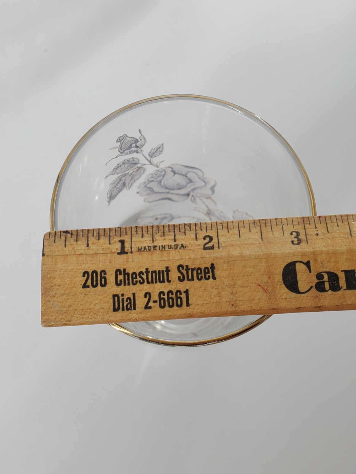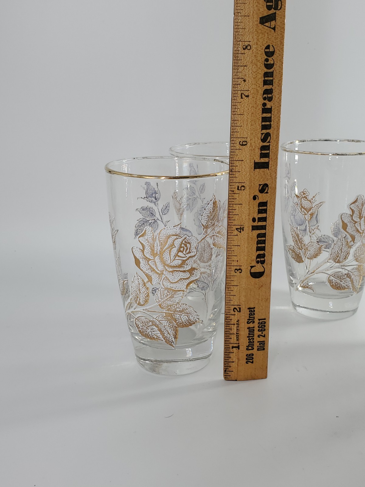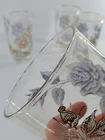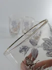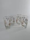This set of 4 Vintage Libbey Rose Bouquet Tumblers from the 1960s features a floral pattern, gold rim, and an iridescent finish. These 12 oz tumblers are perfect for all occasions and have a decorative floral theme. Made in the United States, these vintage tumblers are a charming addition to any barware collection. The elegant design and pressed glass production style make them a unique piece for any home. Do not put in dishwasher. No chips or cracks. There is some gold loss on the glass rim. See pictures.