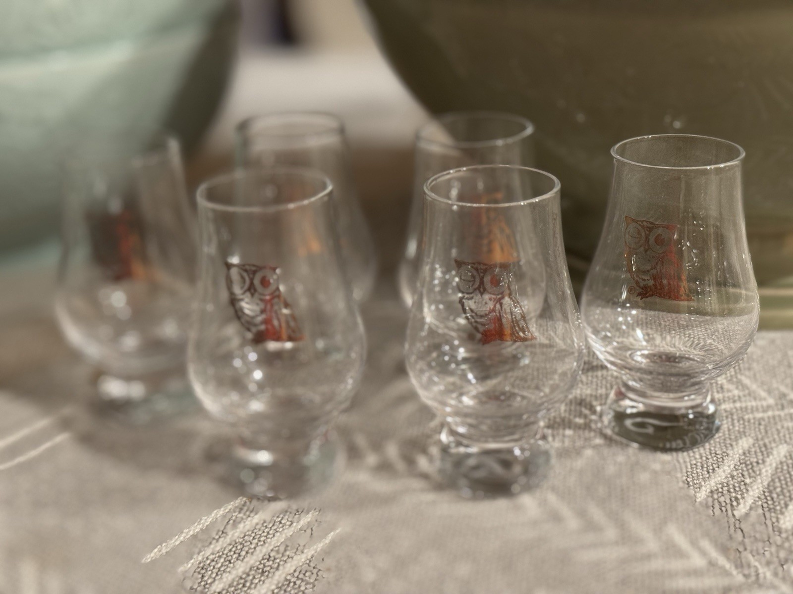 This set of 6 rare Glencairn Wee Whiskey glasses features a unique gold winking owl design etched on the clear glass, adding a whimsical touch to your whisky-tasting experience, specifically branded for the famous Blinking Owl Distillery in Santa Ana, California. The Wee Glencairn glass is a miniature version of the classic whiskey tasting glass, measuring approximately 3.3 to 3.4 inches ( 85mm) in height with a 2.5 oz (70--74ml) capacity. Designed for smaller, concentrated pours, it features the same tapered, lead-free crystal bowl as the original to enhance aromas, and roughly 2 inches (50mm) wide. Key Dimensions & Details: • Capacity: 2.5 oz / 70ml / 74ml • Height: 3.325 in / 3.4 in / 85 mm • Width: ~2 inches (max external bulb width ~1.825 in / 48 mm) • Material: Lead-free crystal • Stem Diameter: 1 in / 24 mm & Cairn Craft +4 The Wee Glencairn is sometimes referred to as the "distiller's glass" or "miniature glass" and is ideal for experiencing single drams. Perfect for casual use, and are engraved with the Glencairn logo, making them a stylish and practical addition to any home bar or dining collection. Enjoy your whisky in style with these charming and collectible whiskey glasses.