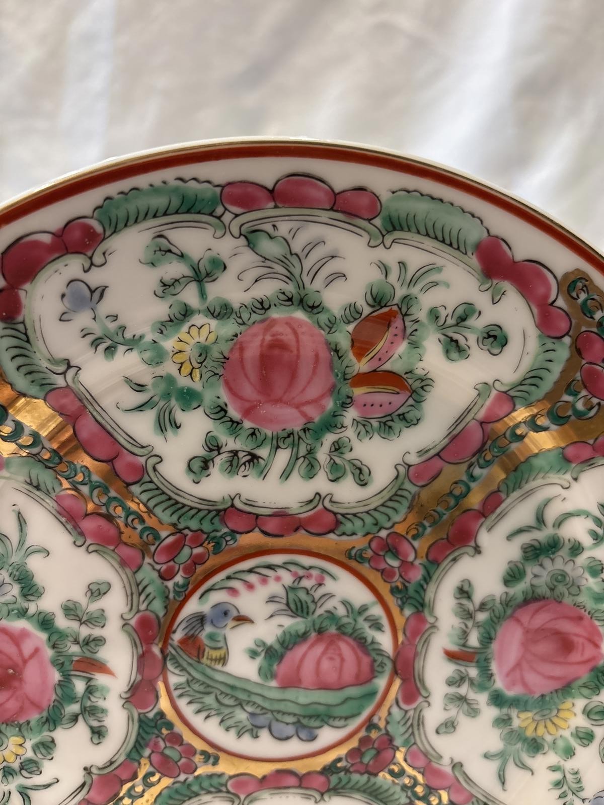 A highly collectible style of Chinese export high-quality porcelain. Date to a transition period between the Late Qing Dynasty (c. 1875–1911) and the early Republic period (1912–1930s), reflecting the high-quality craftsmanship intended for Western markets. Features a circular centerpiece depicting a peony (symbolizing wealth and honor) & a bird. Surrounded by 4 alternating panels depicting flowers. Decorated with vibrant, low-fired overglaze enamels in the "Famille Rose" style, dominated by shades of pink and carmine, alongside green, yellow, and blue. The panels are outlined with borders of green tendrils and a gilt (gold) ground. The rim features a gold band. A standard size for salad or dessert service. The "Fu" (福) mark on the base signifies "Good Fortune" or "Blessing". The presence of a mark is for export wares from the late 19th and early 20th centuries. Late Qing (1875–1911) feature highly detailed painting and gold highlights. Excellent condition.