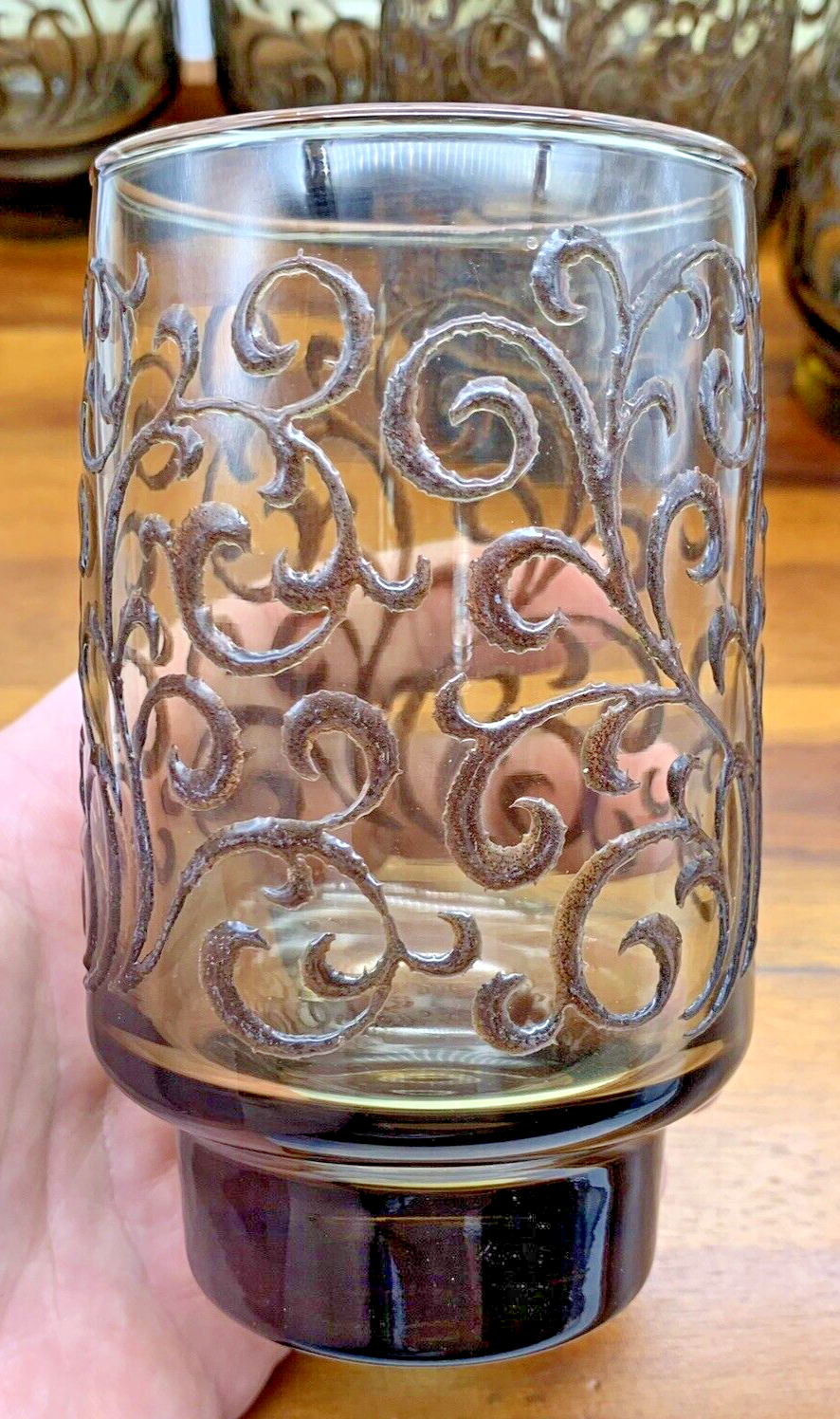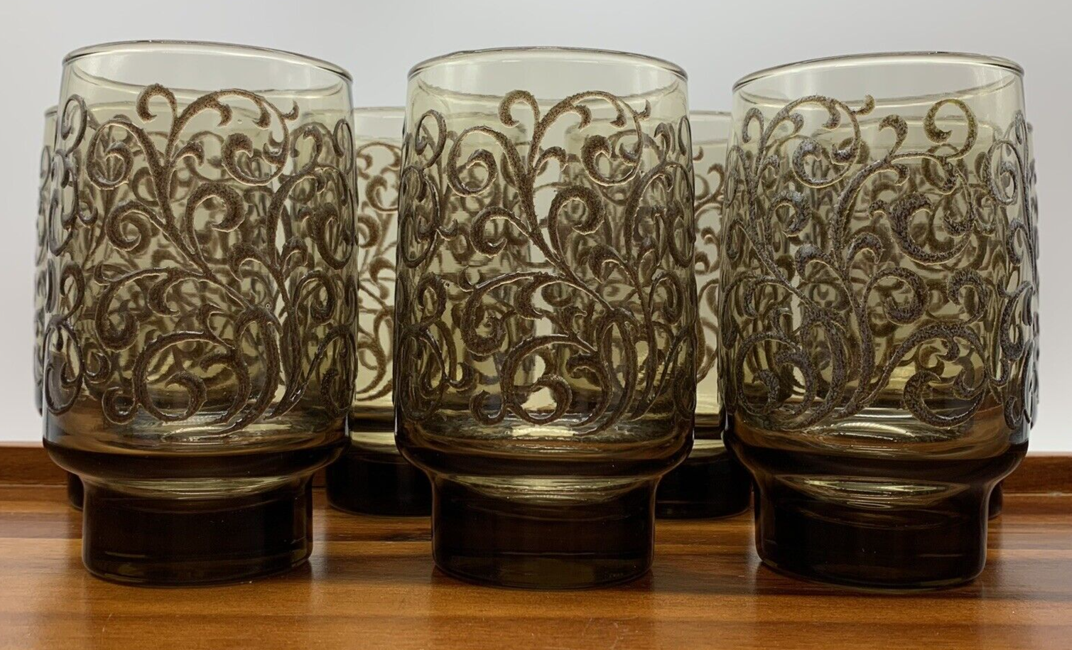 Set of 7 Vintage 1970s Libbey Glass Prado Tawny Brown Scrolls 10 oz Flat Tumblers EUC All in excellent condition, like new! Each stand roughly 4.75 inches tall. Circa 1960s to 1970s. Please zoom in on photos for a better view of the item's condition. We do our absolute best to research all items we sell. If you ever have questions, please reach out to me! We will always package items securely and with care. Thank you for viewing and please visit our store for more awesome vintage goodies!