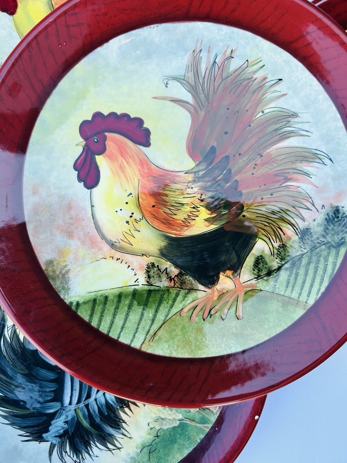 Add a touch of old country charm to your dining table with this set of eight Cracker Barrel Susan Winget Roosters Dinner Plates. The rustic ceramic material and colorful multicolor design make these plates perfect for any home-style dining occasion. The brand, Cracker Barrel, is well-known for its quality and unique designs that reflect traditional country culture. These plates are sure to impress your guests and make your dining experience more enjoyable. Beautiful set of (8) One of the plates contains a small blemish scrape as seen on the images. Beautiful lot I’n as new state. 6.24.24