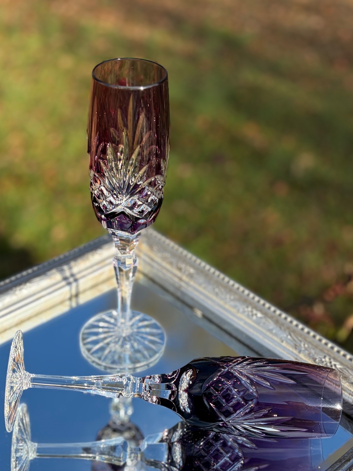 This hand-blown, set of 8, champagne flute collection is made of crystal with a color overlay technique. Then each is hand cut to clear featuring a beautiful fan pattern. The collection features 2 Ruby Red, 2 Amethyst, 2 Cobalt Blue, and 2 Emerald Green champagne flutes. They are unsigned, but appear similar to Ajka “Carolyne” pattern (pictured at the end). The unique cut to clear production technique gives it a beautiful and elegant appearance, perfect for any occasion that will standout and impress! The flutes are 8 7/8” tall, 2 3/4” at base, and 1 7/8” at rim. Upon inspection I found no chips or cracks. Seller does not accept returns so please look at all pictures or ask seller questions before purchase. These are amazingly works of craftsmanship, absolutely beautiful, enjoy! 😊