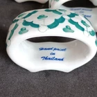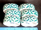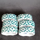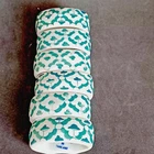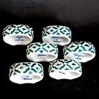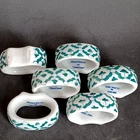 Add a touch of bohemian style to your dining table with this set of six hand-painted napkin rings. Each ring features a unique geometric floral pattern in green and white, perfect for all occasions. These rings are made of ceramic and are perfect for collectors of napkin rings and holders. The set includes six rings, each measuring 2 inches in diameter. The intricate hand-painted details make these rings a beautiful addition to any table setting.