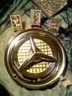 The product is a set of four vintage 14" Olds Fiesta Style hubcaps with a crossbar design in chrome finish. These hubcaps are suitable for rear, left, front, and right placements on vehicles with 14" wheels. They are interchangeable with various models such as Dodge, Plymouth, Ford, Chevy, Mercury, Buick, and Oldsmobile. The manufacturer offers a 6-month warranty on these chrome hubcaps.