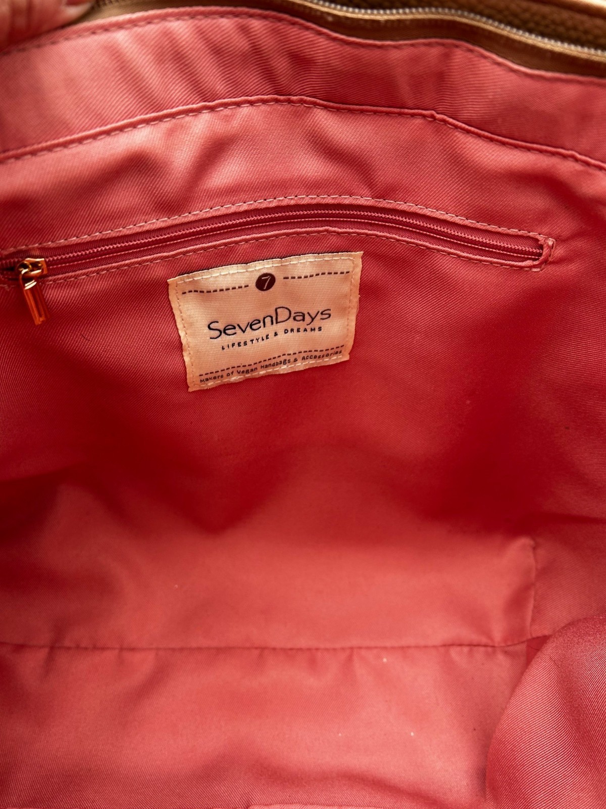 ✅ Unique Feature Made by an ethical brand dedicated to vegan craftsmanship, this bag blends a soft blush tone with a pebbled texture and a practical layout perfect for everyday organization. It’s a great sustainable style statement. Brand: SevenDays – Makers of Vegan Handbags & Accessories Material: 100% polyurethane exterior, 100% polyester lining Color: Blush pink exterior with rose-pink inner lining Straps: Dual adjustable shoulder straps with 13" drop Closure: Full zip-top closure Interior Features: Two slip pockets, spacious open compartment Exterior Features: Large slip pockets on both sides Size: Height: 12" Width: 13" Depth: 6" Strap Drop: 13" Condition: Gently preowned – clean interior. **Minor flaw on one of the handles (see pic)** Style: Minimalist Everyday Tote / Work or School Bag SMOKE-FREE HOME :) Feel free to send offer(s). All reasonable offers are welcome. **WILL SHIP WITHIN 24-HOURS** Features: • LARGE TOTE BAG Size: OS