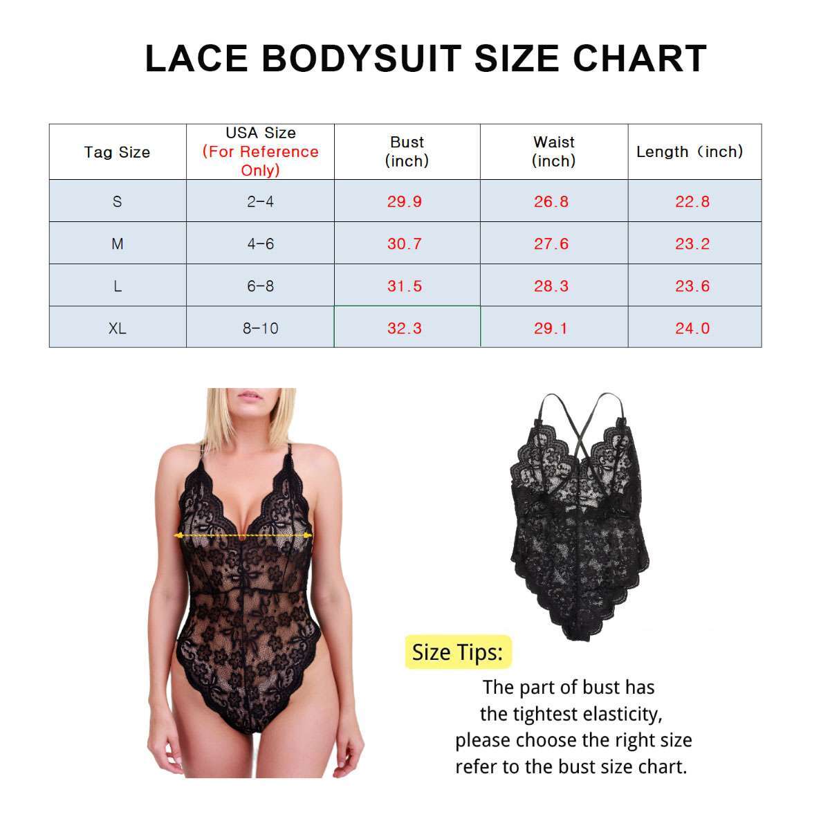 Product Description Specifications: Material: Lace Optional Color: Black, White, Blue Optional Size: S, M, L, XL Pattern: Lace Neckline: V Neck Closure: Pull on Fitting Type: Fit Style: Sexy, Elegant Occasion: Daily, Dating, Lingerie Party, Honeymoon Trip, etc. Care: Hand wash or machine wash with laundry bag in cold water. Features: · FLORAL FULL LACE BODYSUIT: Floral lace bodysuit for women, elegant and pretty, provides you a charming and sexy look. · SCALLOPED DEEP V NECKLINE & LEG OPENINGS: Scalloped deep V neckline highlights your breasts and the curving leg openings highlight your legs and butts, make you more flattering and hot. · ADJUSTABLE CROSS BACK STRAP: The lacy bodysuit has elastic and adjustable spaghetti straps that you can adjust the length to fit your body well, and the cross-back design brings you a feminine back look. · SOFT, LIGHTWEIGHT & COMFY TEDDY LINGERIE: The one piece lingerie is made of soft and stretchy lace fabric, light in weight, breathable and skin-friendly, comfortable to the touch. · EASY TO MATCH: It is perfect to be the sexy top for dating or lingerie for hot night, and it’s easy to match your many tops and bottoms like shirts, jeans, skirts, pants, jacket and so on for a layered look. Notes: * Please kindly check the size chart before purchase. * Due to effect of light, camera and monitors, the item’s real color may be slightly different. * Allow slight dimension difference due to manual measurement. * Thank you for your kindly understanding. WARNING For California Residents: This product can expose you to chemicals including Diisononyl phthalate (DINP), which is known to the State of California to cause cancer. For more information, go to: https://www.p65warnings.ca.gov/. Package Includes: 1 PC Lace Bodysuit (Others are NOT included) Payment Shipping Returns Feedback PayPal is easy and safey, and we can accept PayPal payment Please do not hesitate to contact us if you have any questions of payment procedures 1.Items dispatched to buyer's PayPal comfimed address from Monday to Saturday(Sunday & Holiday excluded) via USPS within 20 hours after payment has been received.Please check your shipping address carefully before checkout.If you want to change the address, pls kindly contact us through ebay message within three hours after payment.Otherwise, any change information may be disregarded once dispatched. 2.Items are generally shipped usually after an approved payment by the buyer(Saturday and Sunday excluded). 3.Shipping from warehouses in CA usually takes 3-5 business days to reach completion for orders within the US placed by USPS first class mail(tracking numbers available). 4.Do not provide local pick up service. Returns will be accepted within 30 days after delivery. However, if the item is damaged upon arrival, buyers must contact us within 3 days after delivery for any refund or replacement. Returns will not be accepted if buyers caused any damages to the item. Refunds are given as Exchange or Money Back. 1.If you are satisfied with the product you received, please leave us positive feedback and 5 scores DSR. 2.If you are dissatisfied for any reason, please donot be quick to leave negative/neutral feedback. Pls contact with us via Ebay message, We work hard to resolve any problem to make sure EVERY CUSTOMER 100% SATISFIED and always leave positive feedback to all our customer. 3.If you feel delighted with this transation, Pls give us all 5-stars. We strive for 5-star service by providing high-quality goods and perfect service. Therefore, pls take the transaction seriously. (Positive)feedback is simply what we seek for. If you have any problems about your purchase, just let us know through "MY MESSAGES". We promise that we will try our best to solve problem for you since our mission as ebay seller is make sure that you are satisfied with your every transaction. So Pls contact us first to get the best solution before leave a (Negativa)or (Neutral)feedback Payment PayPal is easy and safey, and we can accept PayPal payment Please do not hesitate to contact us if you have any questions of payment procedures Shipping 1.Items dispatched to buyer's PayPal comfimed address from Monday to Saturday(Sunday & Holiday excluded) via USPS within 20 hours after payment has been received.Please check your shipping address carefully before checkout.If you want to change the address, pls kindly contact us through ebay message within three hours after payment.Otherwise, any change information may be disregarded once dispatched. 2.Items are generally shipped usually after an approved payment by the buyer(Saturday and Sunday excluded). 3.Shipping from warehouses in CA usually takes 3-5 business days to reach completion for orders within the US placed by USPS first class mail(tracking numbers available). 4.Do not provide local pick up service. Returns Returns will be accepted within 30 days after delivery. However, if the item is damaged upon arrival, buyers must contact us within 3 days after delivery for any refund or replacement. Returns will not be accepted if buyers caused any damages to the item. Refunds are given as Exchange or Money Back. Feedback 1.If you are satisfied with the product you received, please leave us positive feedback and 5 scores DSR. 2.If you are dissatisfied for any reason, please donot be quick to leave negative/neutral feedback. Pls contact with us via Ebay message, We work hard to resolve any problem to make sure EVERY CUSTOMER 100% SATISFIED and always leave positive feedback to all our customer. 3.If you feel delighted with this transation, Pls give us all 5-stars. We strive for 5-star service by providing high-quality goods and perfect service. Therefore, pls take the transaction seriously. (Positive)feedback is simply what we seek for. If you have any problems about your purchase, just let us know through "MY MESSAGES". We promise that we will try our best to solve problem for you since our mission as ebay seller is make su