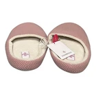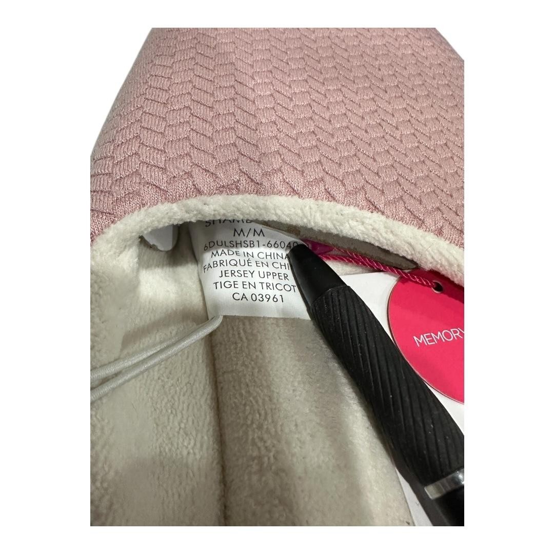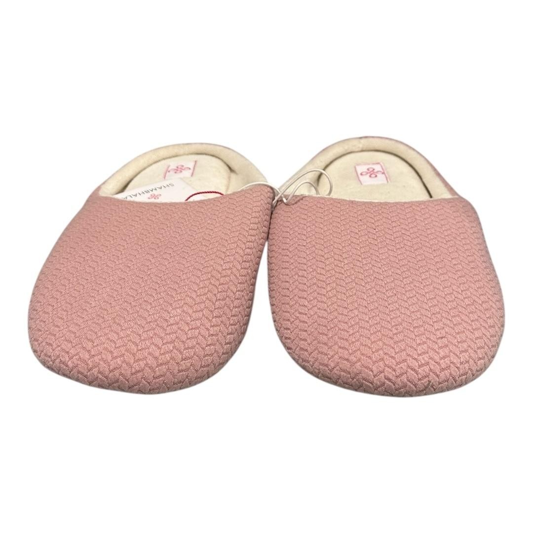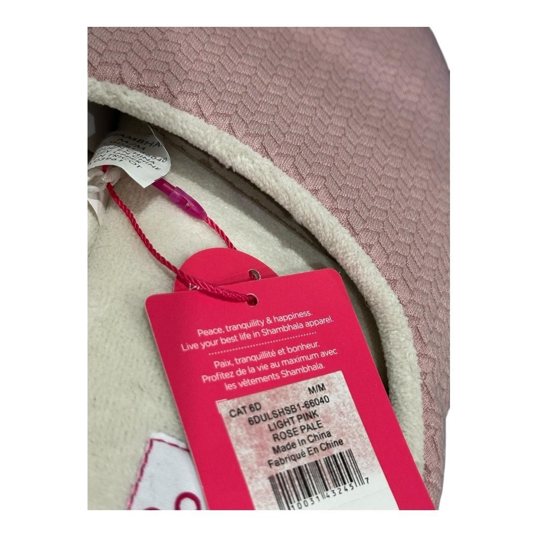 Brand: Shambhala Style: Womens mule slippers designed as indoor house shoes. Color: Rose pink textured chevron jersey upper with cream plush lining and white textured outsoles. Size: Womens US 6 (marked M/M on outsole and inner label). Materials: Jersey fabric upper, soft fabric lining, cushioned memory foam insole, synthetic non-slip outsoles. Details: Slip-on backless mule construction with closed toe, low-profile flat heel, allover chevron knit pattern, contrast fabric trim at collar, Shambhala logo woven footbed labels, dimpled rubberized outsoles for traction on indoor floors, memory foam hang tag attached. Identifiers: Style code 6DULSHSB1-66040, color name ROSE PINK, EAN: 8083151252147, made in China. Condition: New with Shambhala hang tags attached; soles show a few small storage marks from handling, uppers and lining clean and unworn. Original shoe box is not included.