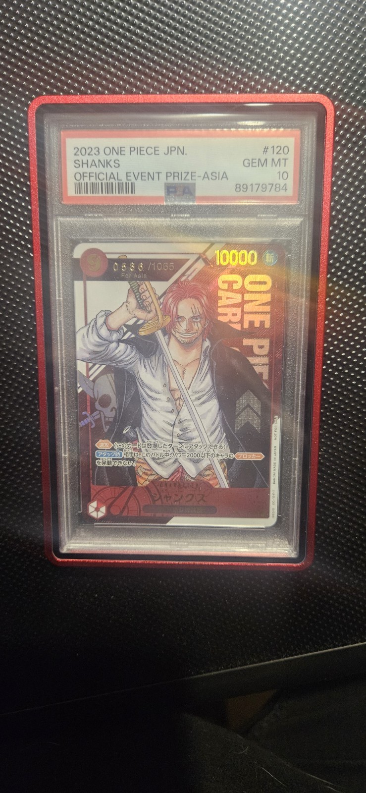 The product is a rare and coveted Shanks character card from the One Piece CCG set, manufactured by Namco in 2023. This English-language card features a unique serial number and a foil finish, making it a highly sought-after collectible for fans of the One Piece series. With an impressive attack power of 10000, this promotional card is sure to be a valuable addition to any collector's deck.