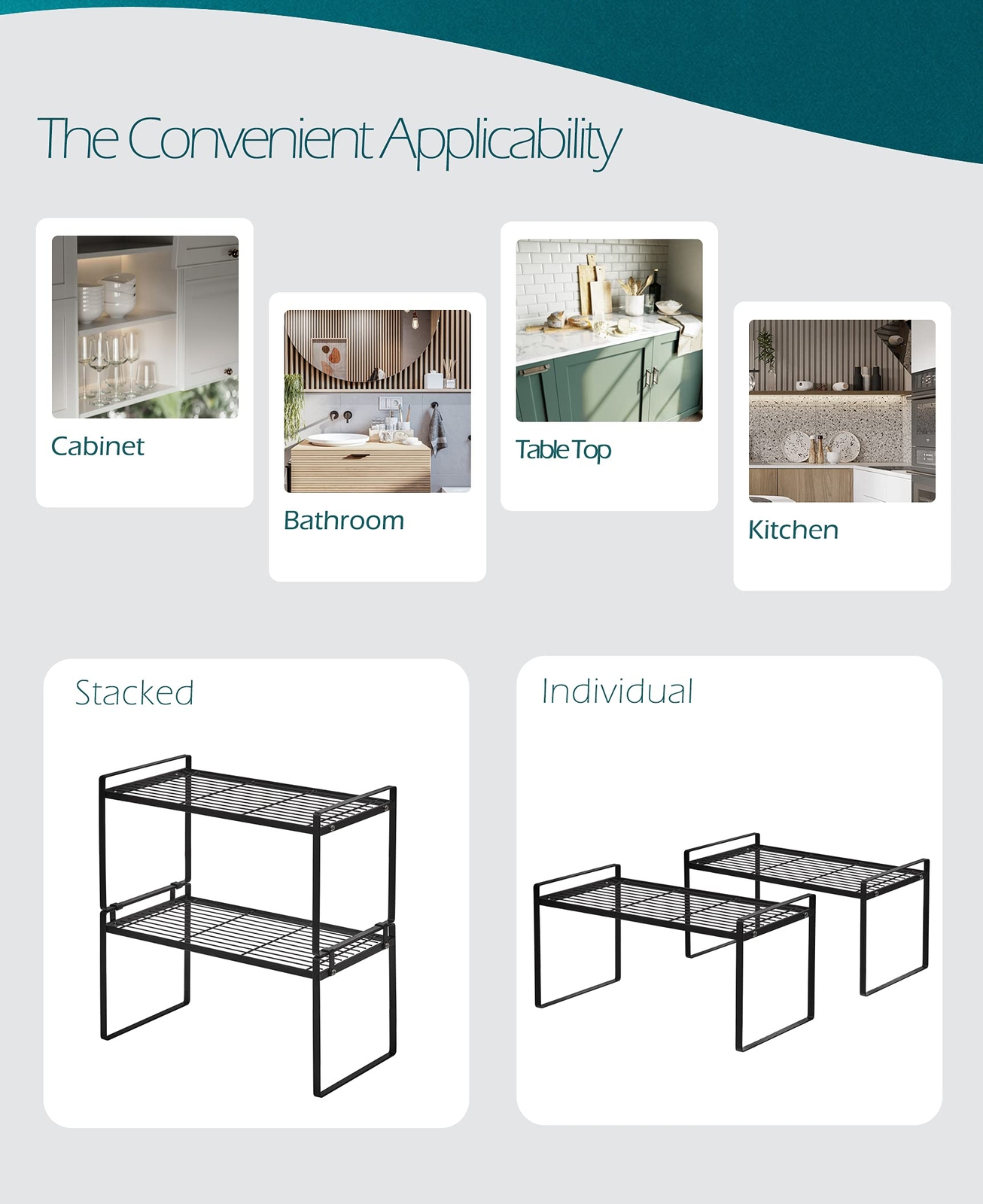 Shantton 2Pack Cabinet Shelf Organizer Storage Rack Space Saving for Kitchen Counter Pantry Bathroom Cupboard Under Sink Office Table Steel Stackable Rust Resistant Heavy Duty Nonslip 16” Black - Tall MULTIFUNCTIONAL: These cabinet shelves can be used individually or stack one to the other to become a 2 tiers shelves to organize your items. They are great organizers for your cabinet, pantry, cupboard, closet, drawer or counter top in kitchen, bathroom, bedroom and under the sink. With the mesh design board, it can be a drying rack for dishes, bottles, plates. EXTRA SPACE: These stackable cabinet shelves maximize storage efficiency, providing more spaces as a riser which allows you to use the upper space. The added storage space helps organization and tidiness. All the wee little bottles, tins, vials, pans and a myriad of other kitchen utensils could go underneath, the middle or the top of the cabinet shelf, reaching with ease. STURDINESS and RELIABILITY: Made with heavy duty metal that built to last. With the well-finished coating on so won’t get rusty and smooth to the touch. The bottoms of the stand frame with non-slip pads attached so it will stay securely and won’t slip off the surface. They are an absolute beautiful addition to your home or office. MAX UTILITY: It can be a shelf or rack to serve your organizing purpose. It’s a great organizer for dishes, bottles, cans, pots, pans. It’s also a rack for snacks, spices, seasonings, fruits and so on. It helps to make spaces more efficient and tidier. SPECIFICATION: Individual one shelf: 16 * 8.3 * 9.5 inches. Stacked two shelves: 16 * 8.3 * 19 inches. Loading Capacity: 40lbs. Manual and assembly parts includes in the package. You’re welcome to contact us if you have any problems with our products. Shipping We offer FREE shipping on all orders! We ship within Three business days of payment, usually sooner. We use a selection of shipping services such as UPS, FedEx, USPS etc. We only ship to the lower 48 states, no APO/FPO addresses or PO Boxes allowed. Local pickups and combined shipping options are not provided at this time. Return You can return a product for up to 30 days from the date you purchased it. Any product you return must be in the same condition you received it and in the original packaging. Please keep the receipt. Payment We accept payment by any of the following methods: PayPal Please pay as soon as possible after winning an auction, as that will allow us to post your item to you sooner! Feedback Customer satisfaction is very important to us. If you have any problem with your order, please contact us and we will do our best to make you satisfied. Contact Us If you have any queries, please contact us via ebay. We usually respond within 24 hours on weekdays. Please visit our eBay store to check out other items for sale! Thank you for shopping at our store.