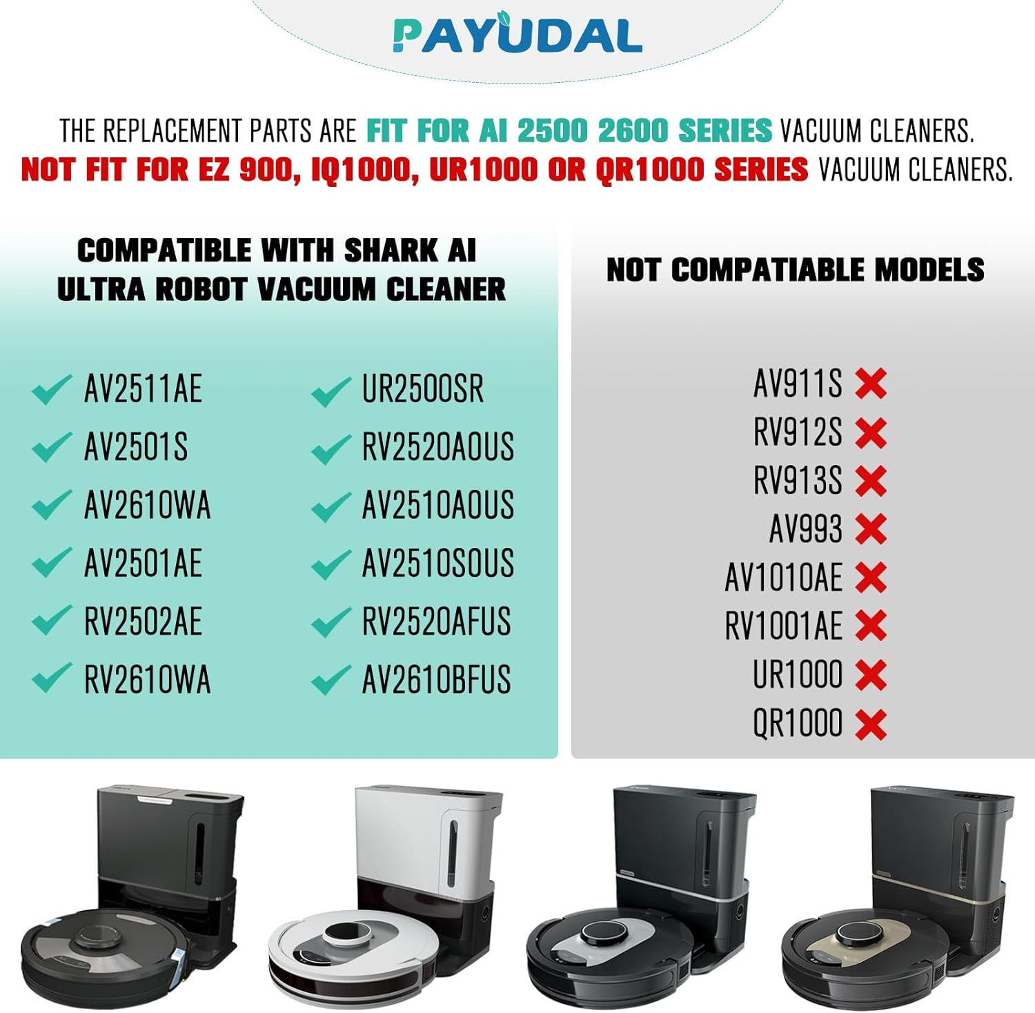 Store New Arrivals Add to Favorite View Feedback Contact Replacement Parts for Shark AI AV2511AE AV2501S AV2610WA AV2501AE RV2502AE RV2610WA RV2520 AV2510 2-In-1 AI Ultra Robot Vacuum Cleaner Accessories Kits. Main Brush, HEPA Filter, Foam Filter,Side Brush Description Item model number RV2502AE Replacement Filter Kit Reusability Reusable Number of pieces 19 Batteries required No Brand PAYUDAL Material Foam Item Weight 12.3 ounces Color 1+4+8+2+1+1 Manufacturer PAYUDAL Package Dimensions 10.47 x 7.13 x 3.82 inches Number of Pieces 19 Compatible Models: The replacement parts kits compatible with Shark AI AV2511AE, AV2501S, AV2610WA, AV2501AE, RV2502AE, RV2610WA, UR2500SR, RV2520AOUS, AV2510AOUS, AV2510SOUS, RV2520AFUS, AV2610BFUS, RV2610WD, UR250BEOUS, UR250BEYUS, UR250BEXUS, AV251WAXUS, AV251WAOUS, RV2610BFUS, AV2610BZUS, RV2610BTUS, RV2610BZUS, RV2820AE, RV2520, RV2510, UR250BE0US, RV2402WXUS, RV2400WD, RV2410WD, 2-In-1 AI Ultra Robot Vacuum Cleaner Accessories Kits. Any use of the brand name or model designation for this product is made solely to demonstrate compatibility. Not Compatible Models: EZ 900, IQ 1000, UR1000, Or QR1000 Series vacuum cleaners. Please check your model before making an order. Premium Material: Our replacement parts kits are designed in high-strength materials to ensure optimal performance working as well as the original accessories. Value Pack: Contains: 1*Main Roller Brush, 4*Pre-Motor HEPA Filters, 1*Pre-Motor Prefilter, 8* Sweep Side Brushes, 2*Base Pre-Moter Foam Filters, 2*Base Pre-Moter Felt Filter, 1*Base Post- Motor HEPA Filter, 1*Base Post- Motor Foam Filter. It is cost-effective and the right choice for you. Replacement Frequency: Please clean the filter frequently, we recommended to replace the brush and filter every 2-3 months, also depending on the frequency of use, to keep the vacuum working with high performance and to extend your vacuum Cleaner life. Easy Installation: Easy to install and replace without any tools. If you find that your robot is noisy or doesn't work, please kindly check whether the roller brush is stuck due to not cleaning hairs for a long time. B09T4YZGQR, B0B89C8H4Q, B08QZVSC8D, B09H8CWFNK, B09WZQ5M61, B0B2RBXD83, B0C1HTPTFJ, B0C7RP5TGL, B0B8B6N2G4, B09J88GNW3, B0BPC54599, B0D3PXDGCD, B0CHL2FQBW Product Description ABOUT US We offer the best prices around on high quality products. Our E-store includes media such as books, movies, music and games while offering electronics, toys, sporting apparel, clothing, tools, general home, garden items and more. SHIPPING We are always working hard to ensure your package arrives as soon as possible. Please understand that some factors like weather, high postal traffic, and the performance of shipping companies are outside of our control. We offer free shipping to the lower 48 states and ship within 2 business days of payment, usually sooner. We do not accept P.O. Boxes. Please provide a physical address. RETURNS We offer a 30-Day Return Policy on items which you are not completely satisfied with. You have the option for a full-refund or an exchange of the item. No returns are available on items shipped outside of the USA. PAYMENT We accept PayPal. CONTACT US This page content is yet to come Please ad us to your favorite seller and visit again later Thank You CUSTOMER SATISFACTION We try our very best to make sure every customer is completely satisfied. If there's a problem, message us! We're happy to help.