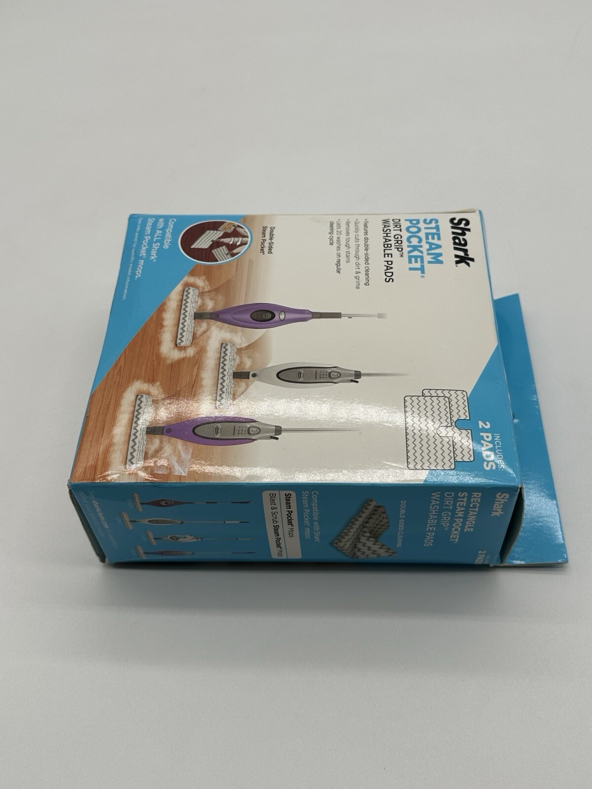 The Shark Steam Pocket Dirt Grip Washable Pads Model XT3601 includes 2 white mop refill pads designed for Shark steam mops. These pads are compatible with Shark steam mop models and are suitable for cleaning various surfaces using the power of steam. The set of pads is brand new and provides a convenient solution for keeping your floors and surfaces clean and sanitized.
