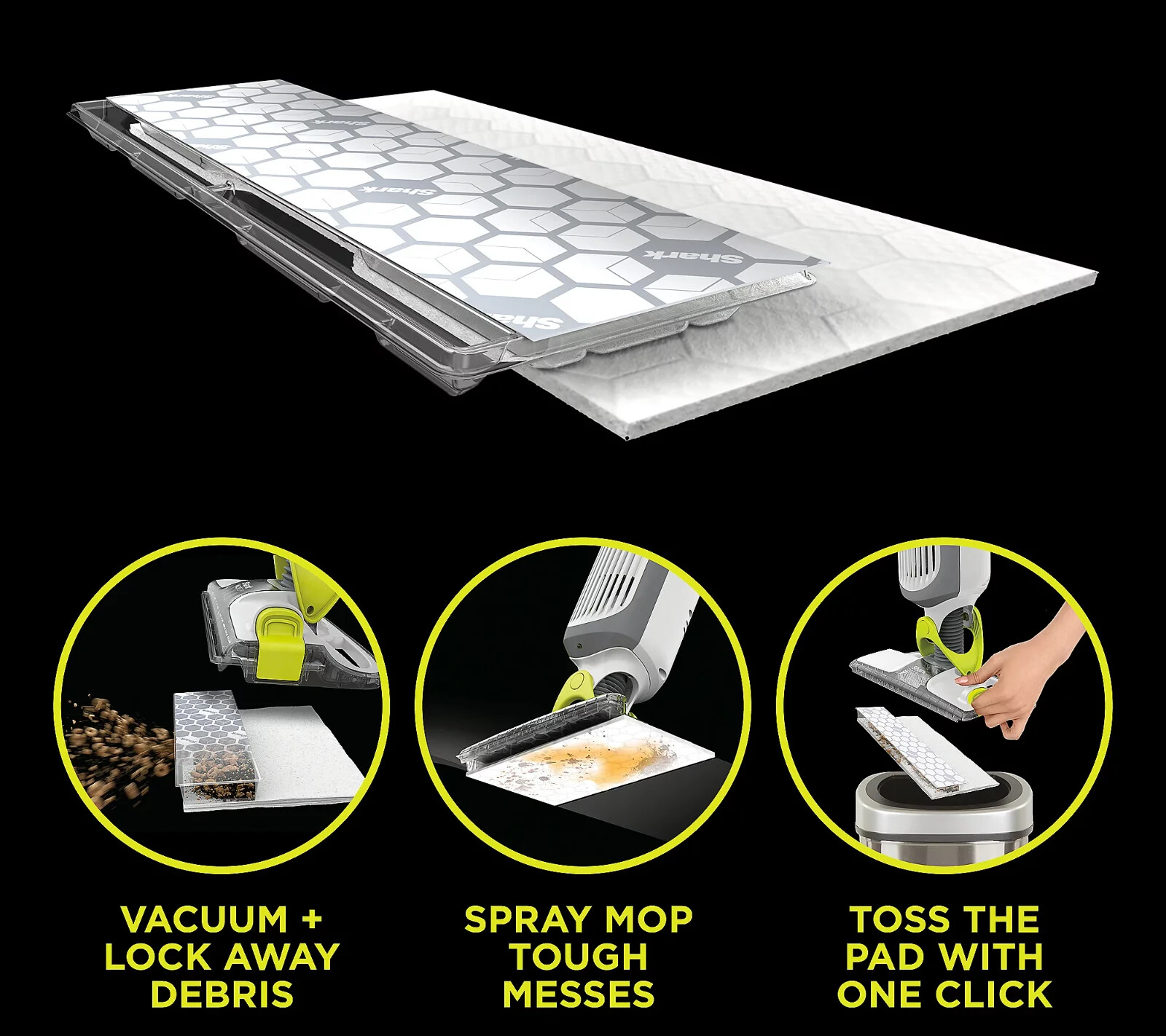 Description The Shark VACMOP combines powerful suction and spray mopping in one disposable pad. Vacuum dry debris, scrub wet messes, and toss the pad. From Shark. Includes VACMOP, 12 disposable pads, and 12-oz cleaning solution Measures approximately: 9.8" L x 6"W x 48"H