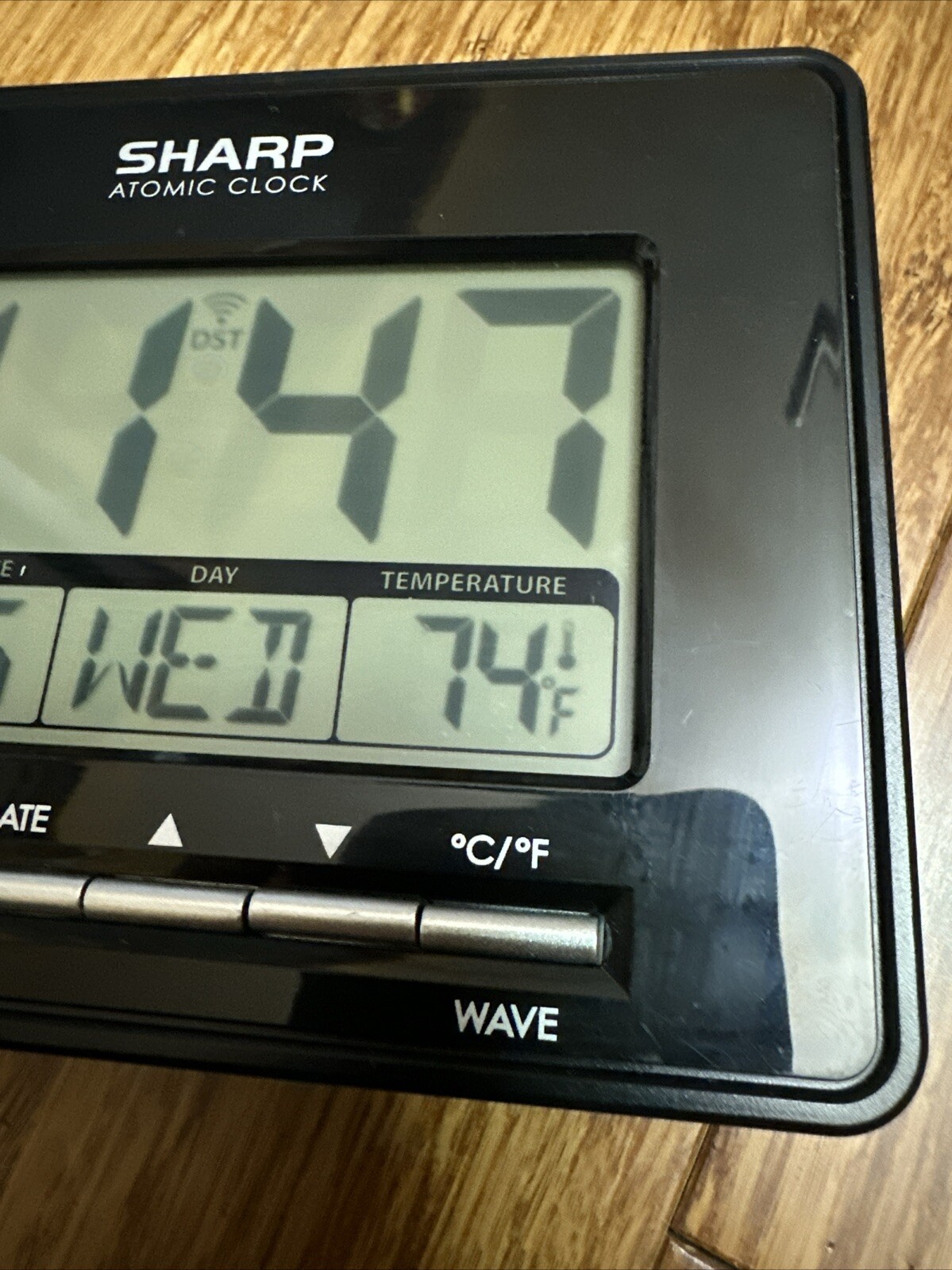 Stock#AB Sharp Desktop Clock SPC932 Atomic Accuracy Time Date Temperature Alarm Used in great condition Come with batteries.