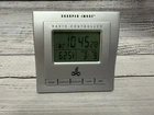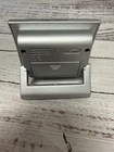This is a Sharper Image radio controlled atomic travel alarm clock with a green backlit LCD display. Very good pre-owned condition - tested and working. Compact size, great for travel, measures approximately 3-1/4" wide x 3-1/4" tall x 1" depth. Features a folding table stand that also has a switch that activates the green LED backlight for about 3 seconds when pressed. Requires 2 AAA batteries for power. Very good cosmetic condition. Please see pictures for more information. Thank you for looking. Have a great day.