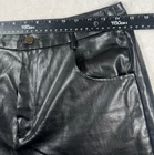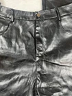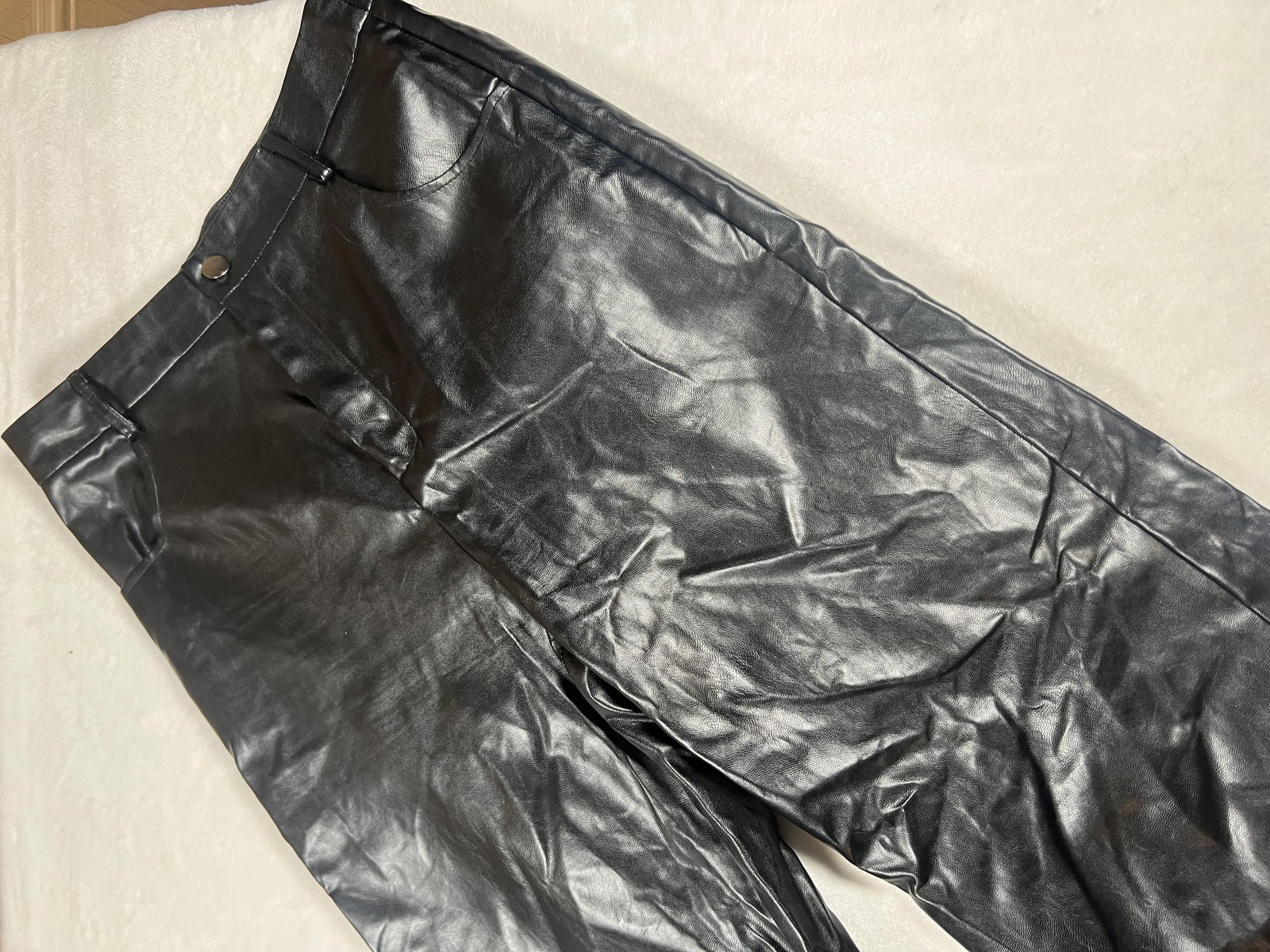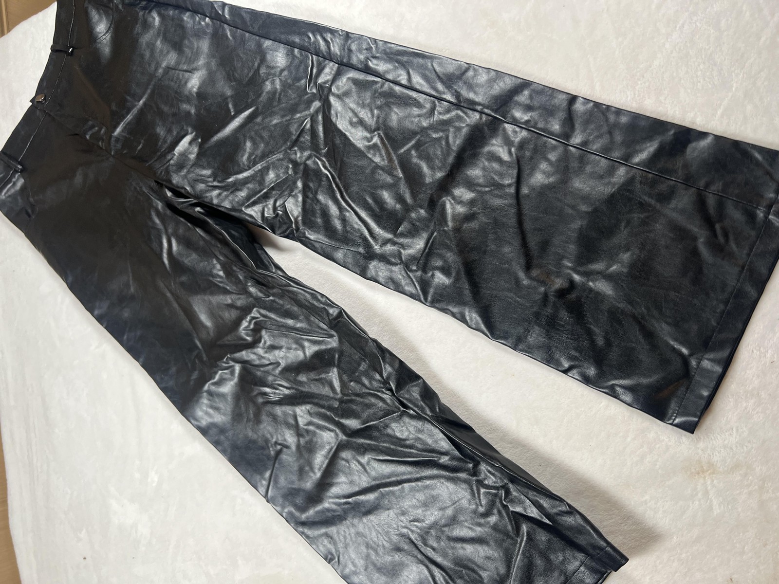 Brand: SHEIN Style: Womens faux leather dress pants with a modern wide-leg silhouette. Color: Solid black. Size on tag: Medium (US 6, EU 38); regular fit. Material: Faux leather outer with soft woven backing; Made in China. Details: Zip fly with button closure, belt loops at waistband, front hand pockets, back welt pockets, sleek faux leather finish suitable for casual wear or party/cocktail outfits.