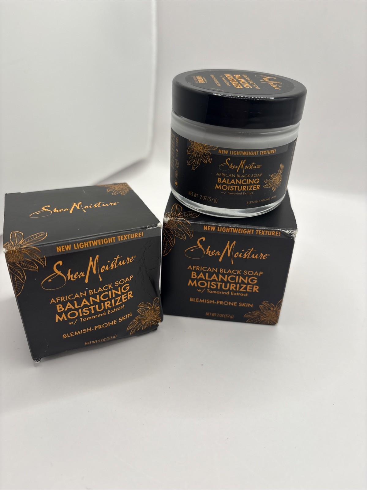 2 Pack: Shea Moisture African Black Soap Balancing Moisturizer 2oz. ea. E13E. ** Please note I have 4 sets of these and some of the boxes are not in the best of condition. The product however is fine. I photographed the worst of the boxes.