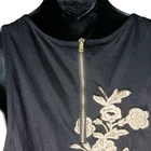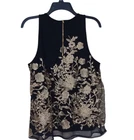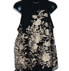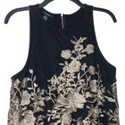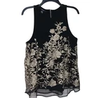 Alfani Sheer Black Mesh Sleeveless Tunic Black with Gold Floral Embroidered Size Medium Black sleeveless top fully lined with black mesh overlay embroidered with gold flowers Back zipper in gold metal Approximate measurements laying flat: Chest: Armpit to armpit: 17" Length: Shoulder to end of top: 27" Great addition to your holiday or New Year's attire.