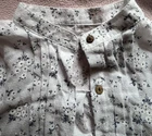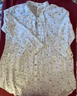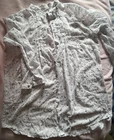 Sheer white over shirt - button front shirt has blue and white print flowers, long sleeves and patch type pockets on front. No tag on shirt at all so measures are: back neckline to hem is 37 inches; arm pit to arm pit is 26 inches; sleeve from shoulder seam to cuff 23 inches.