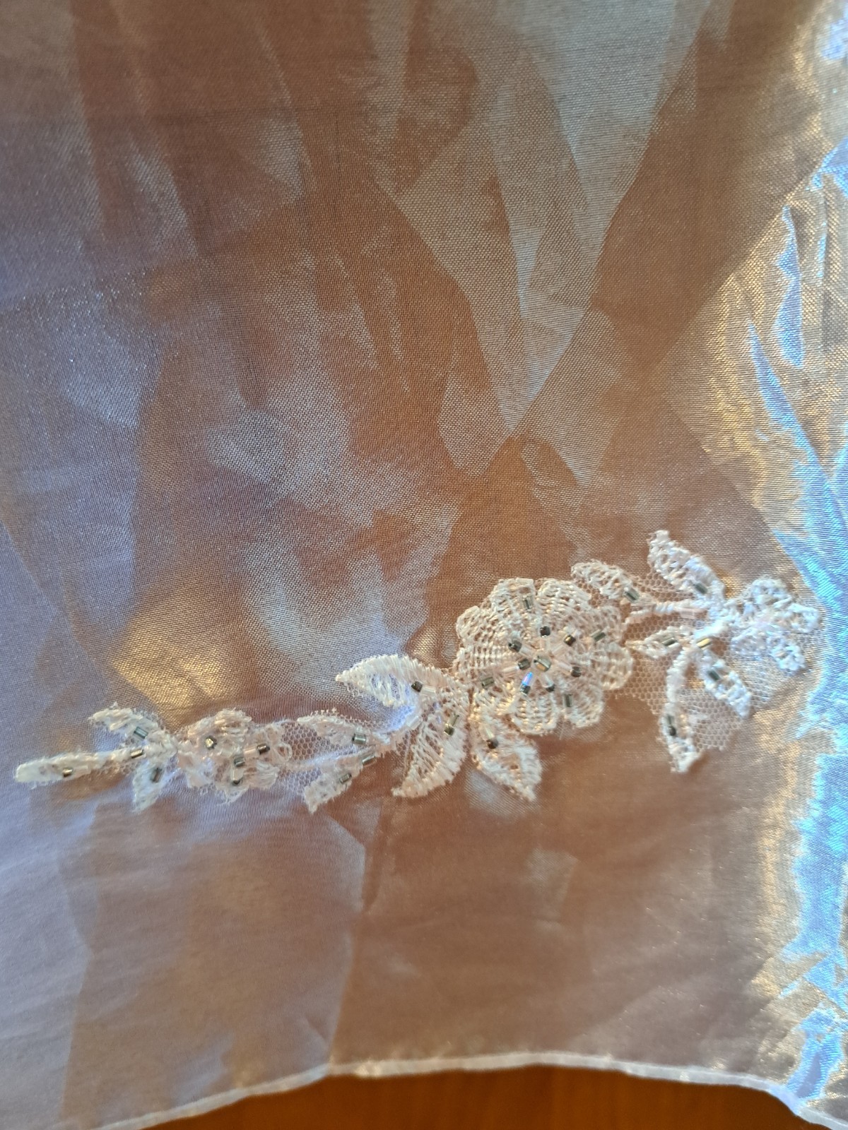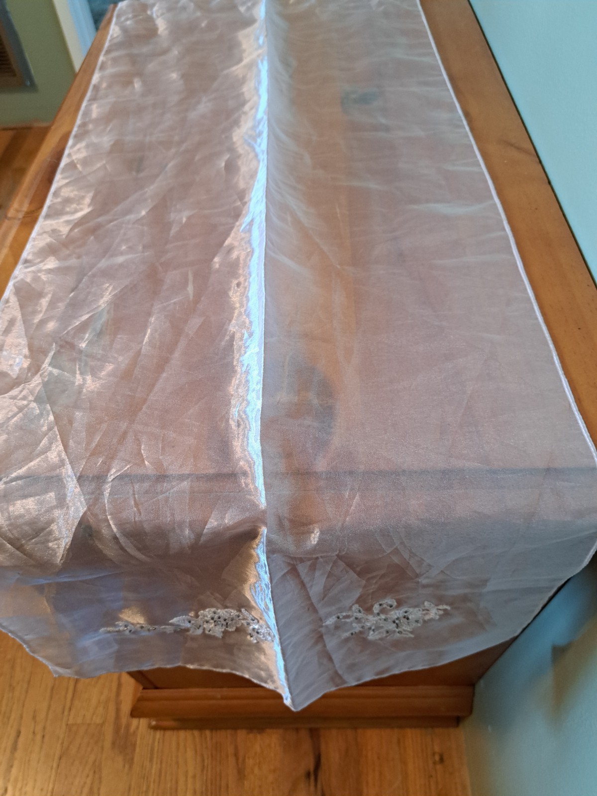 Sheer Pink Embroidered Scarf 14x72 Inch. Unsure fabric content, sheer silky, no labels. Could be used as dresser scarf.